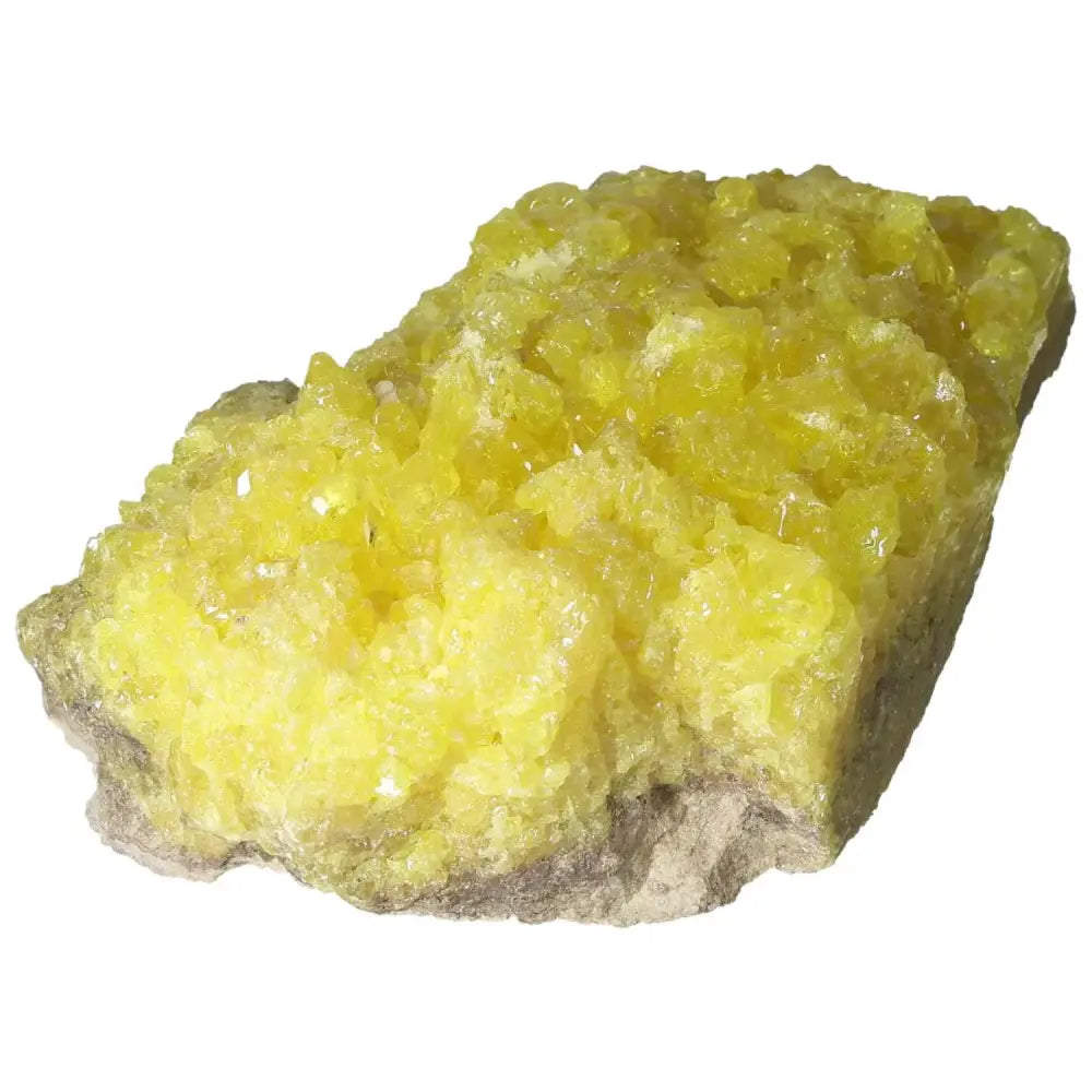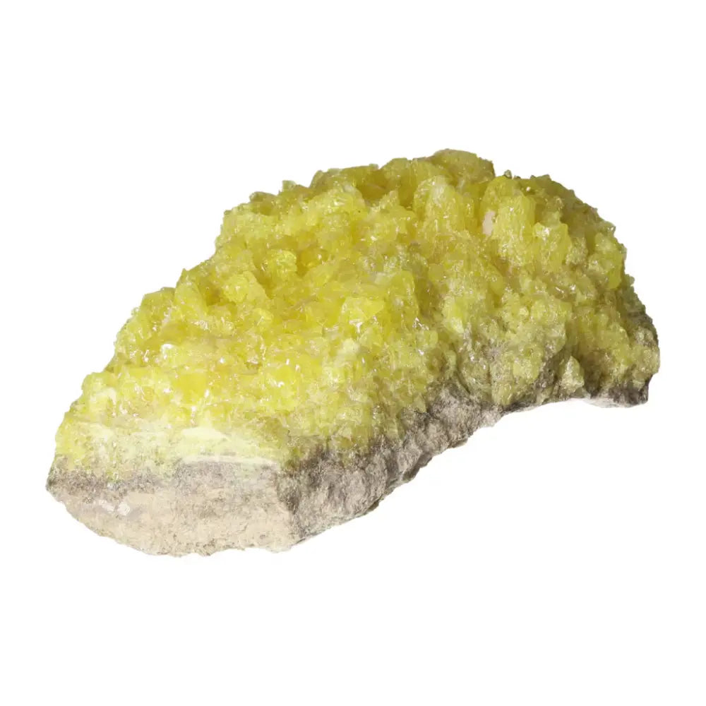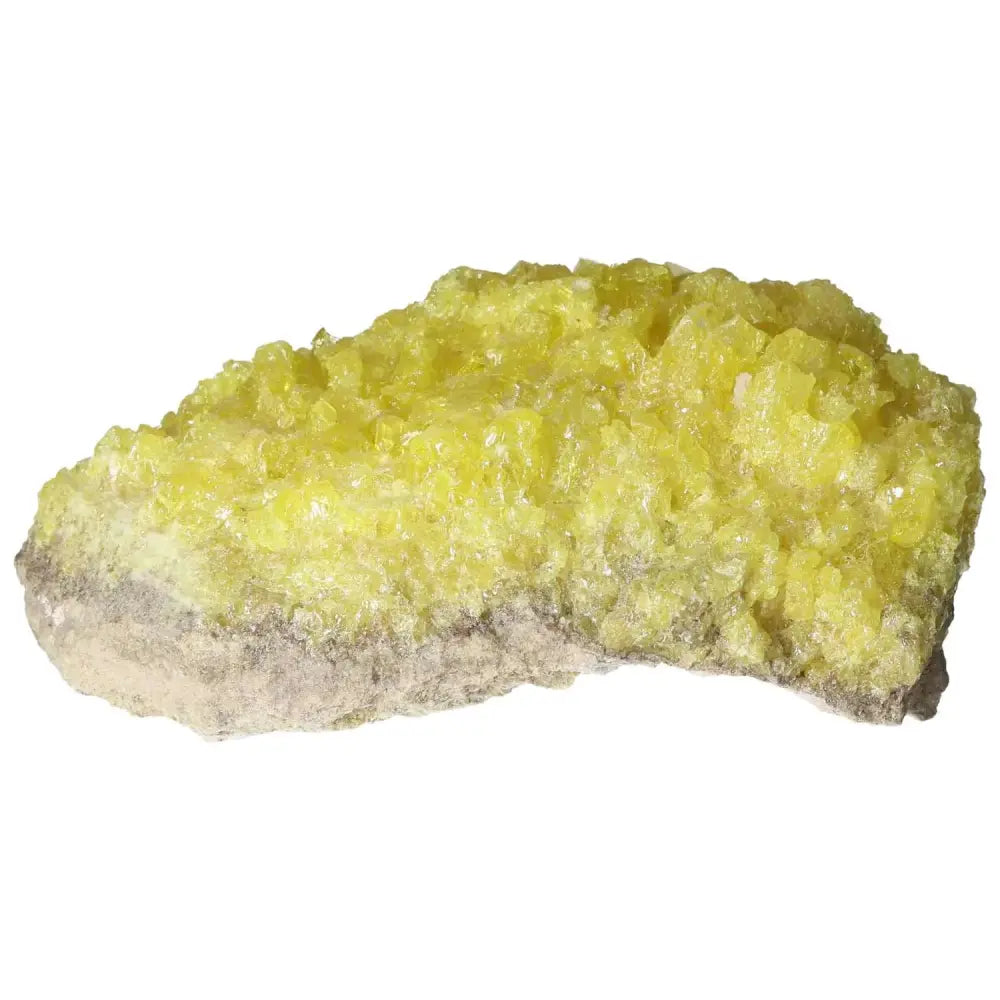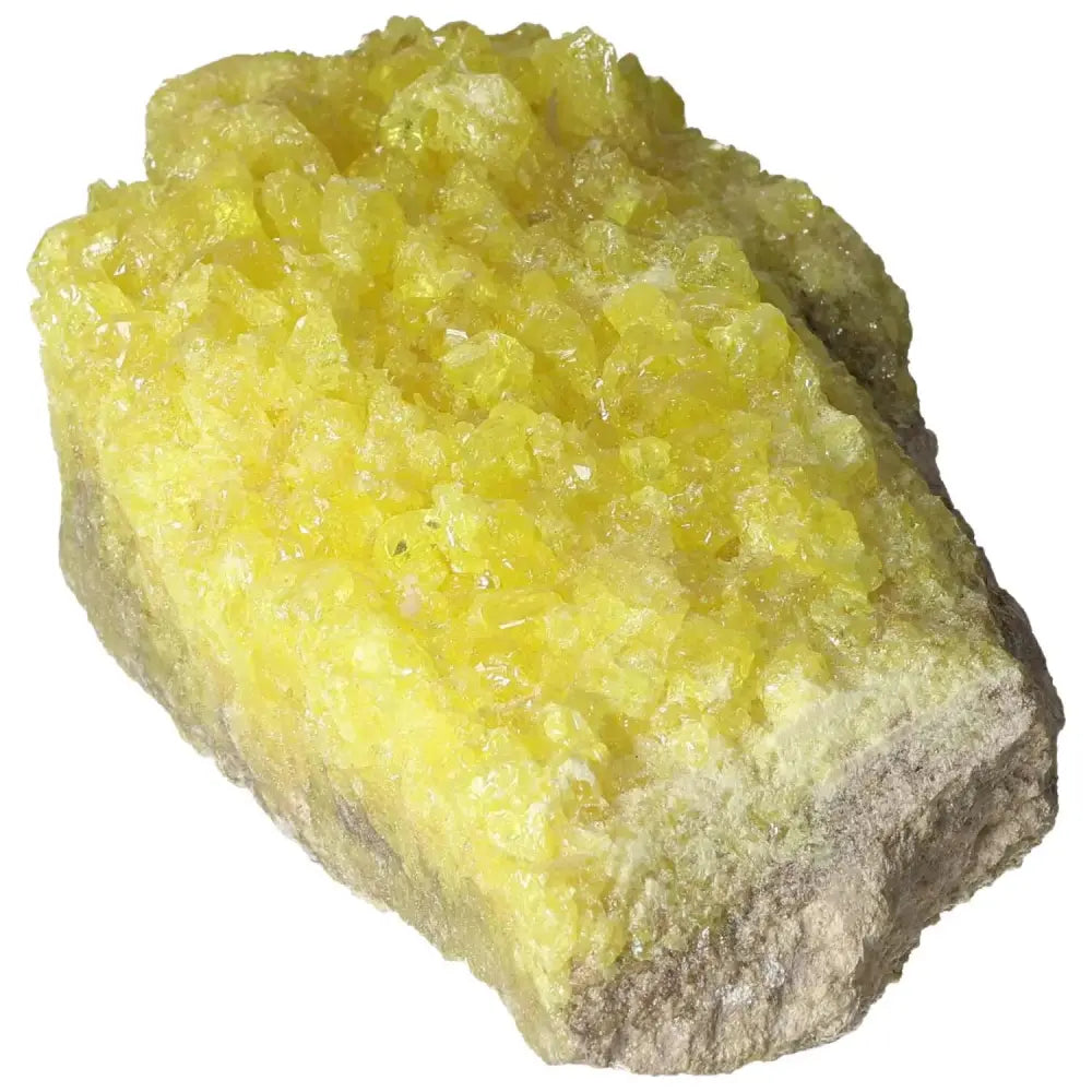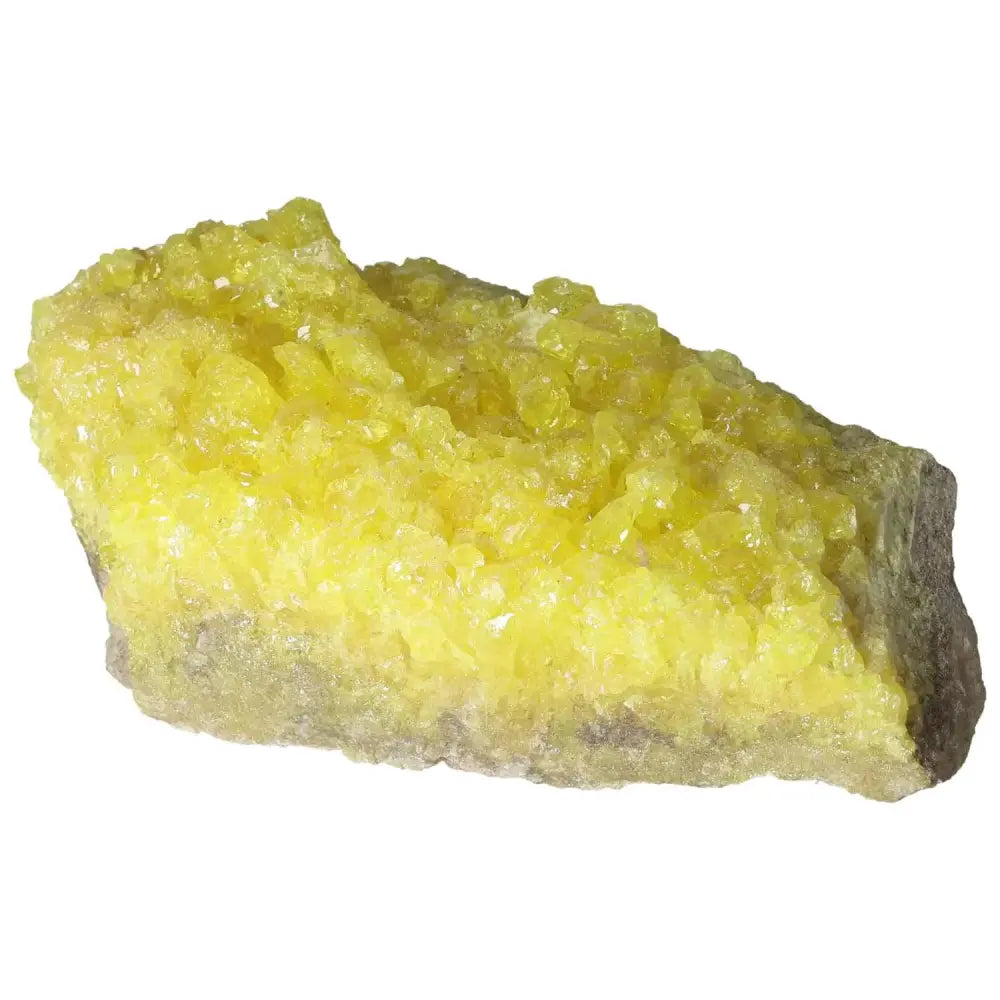 Rough Sulphur Druze mineral with vibrant yellow hues from Sylvia Crystals, known for energizing properties and intricate druze texture.