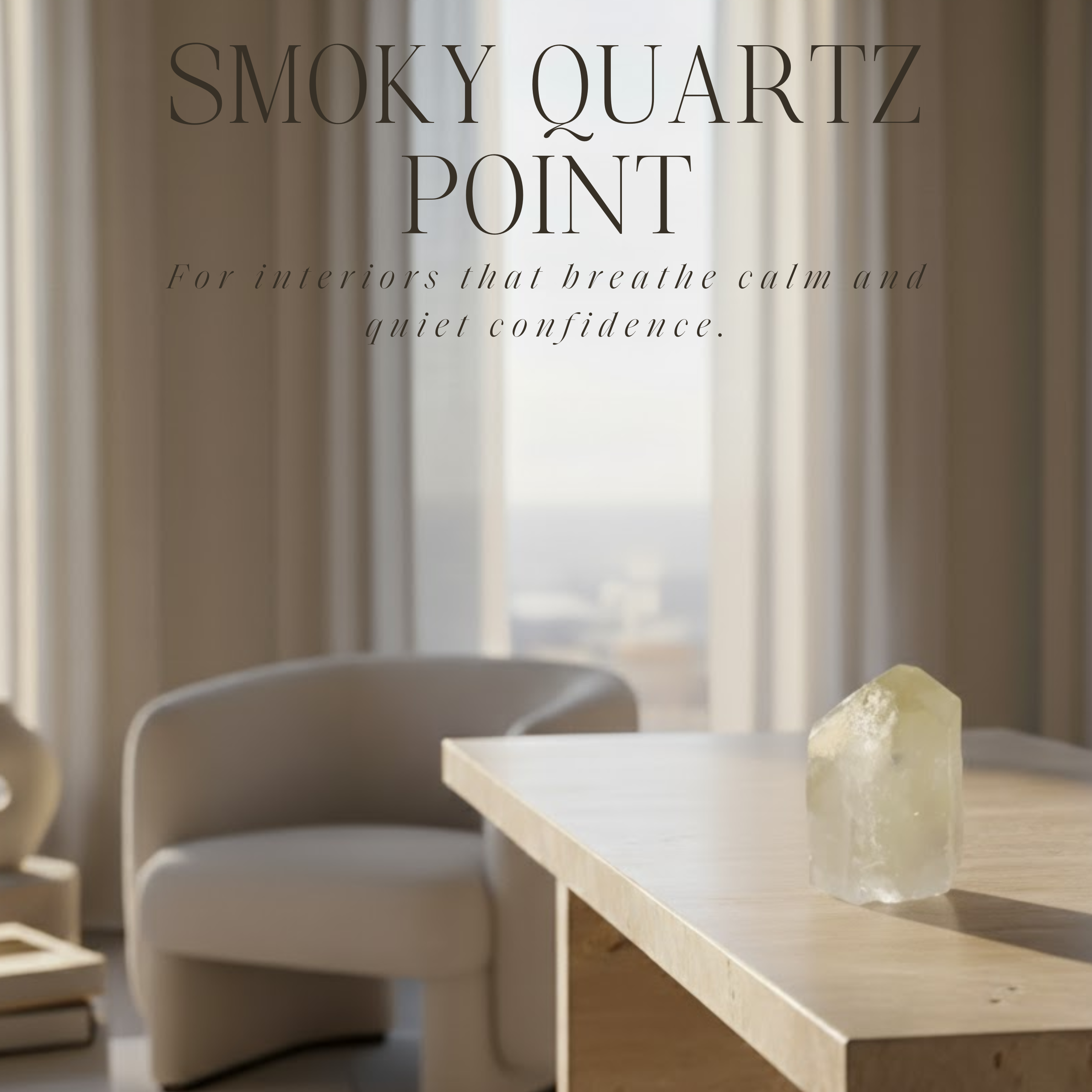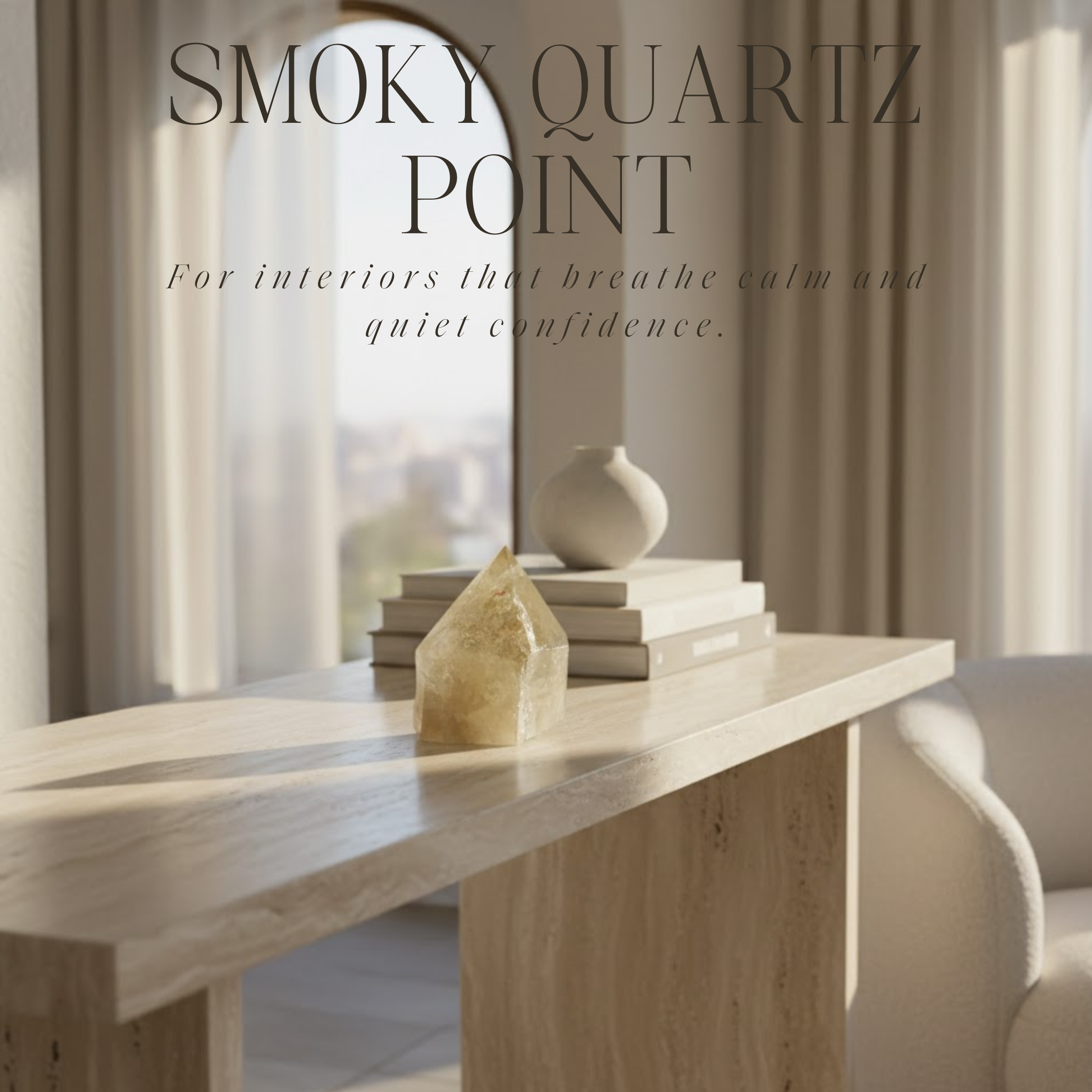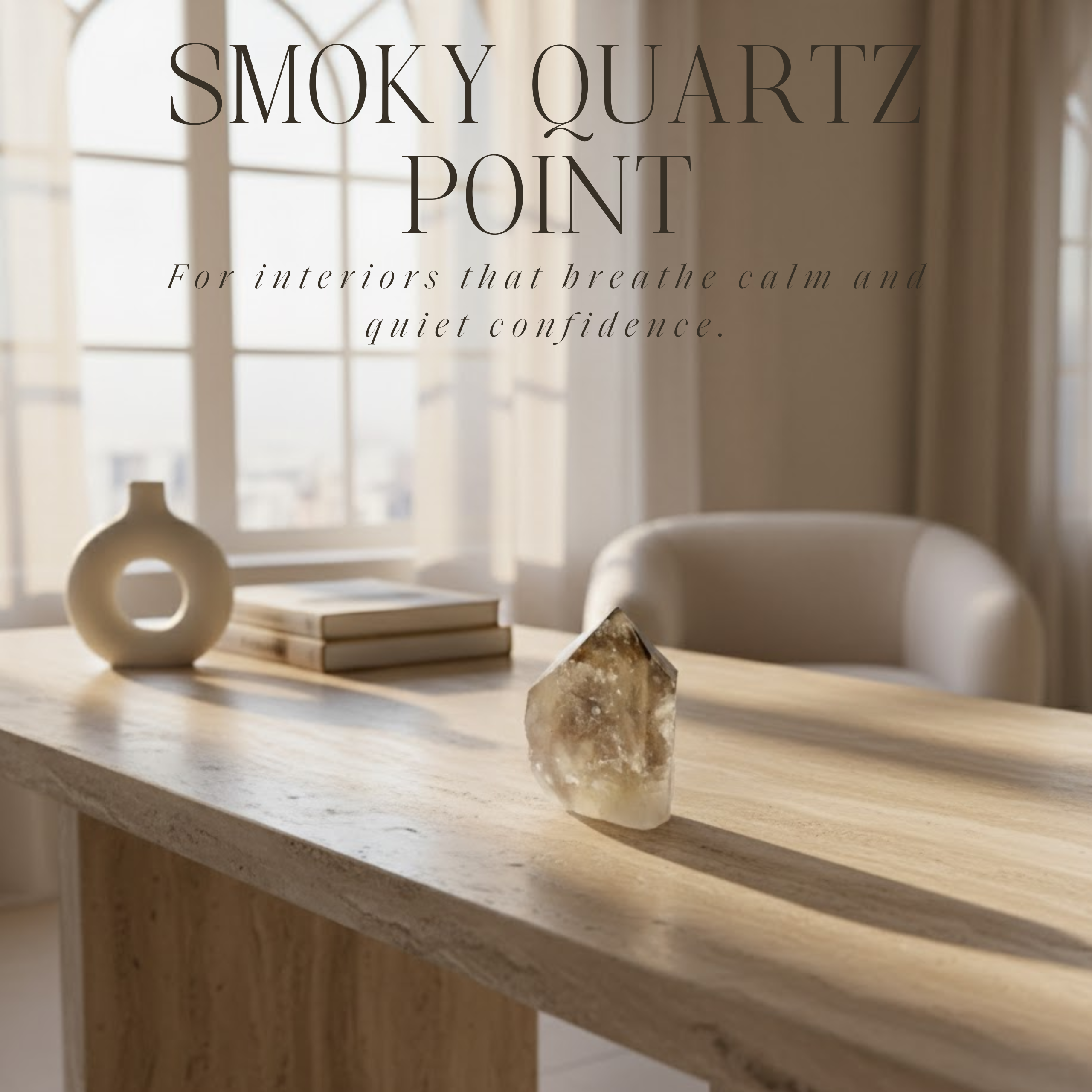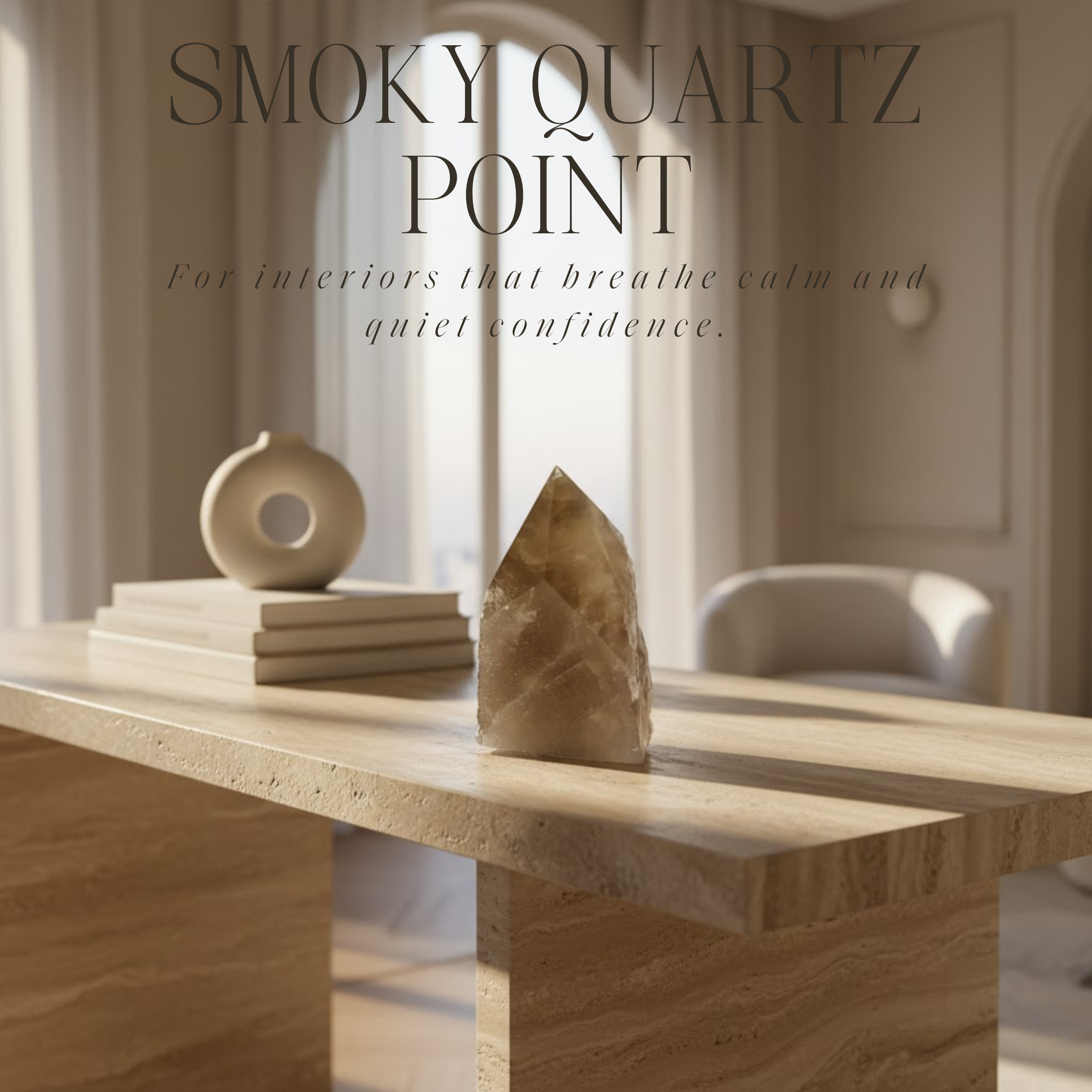 Pololeštěný kouřový křemenový hrot s podstavcem