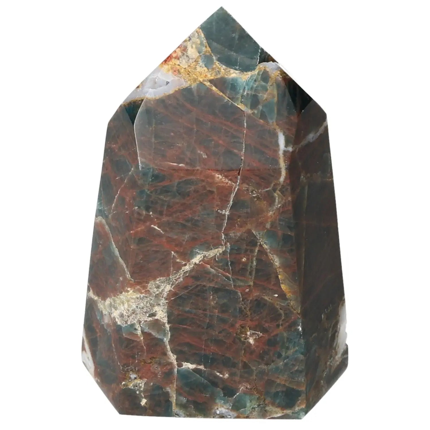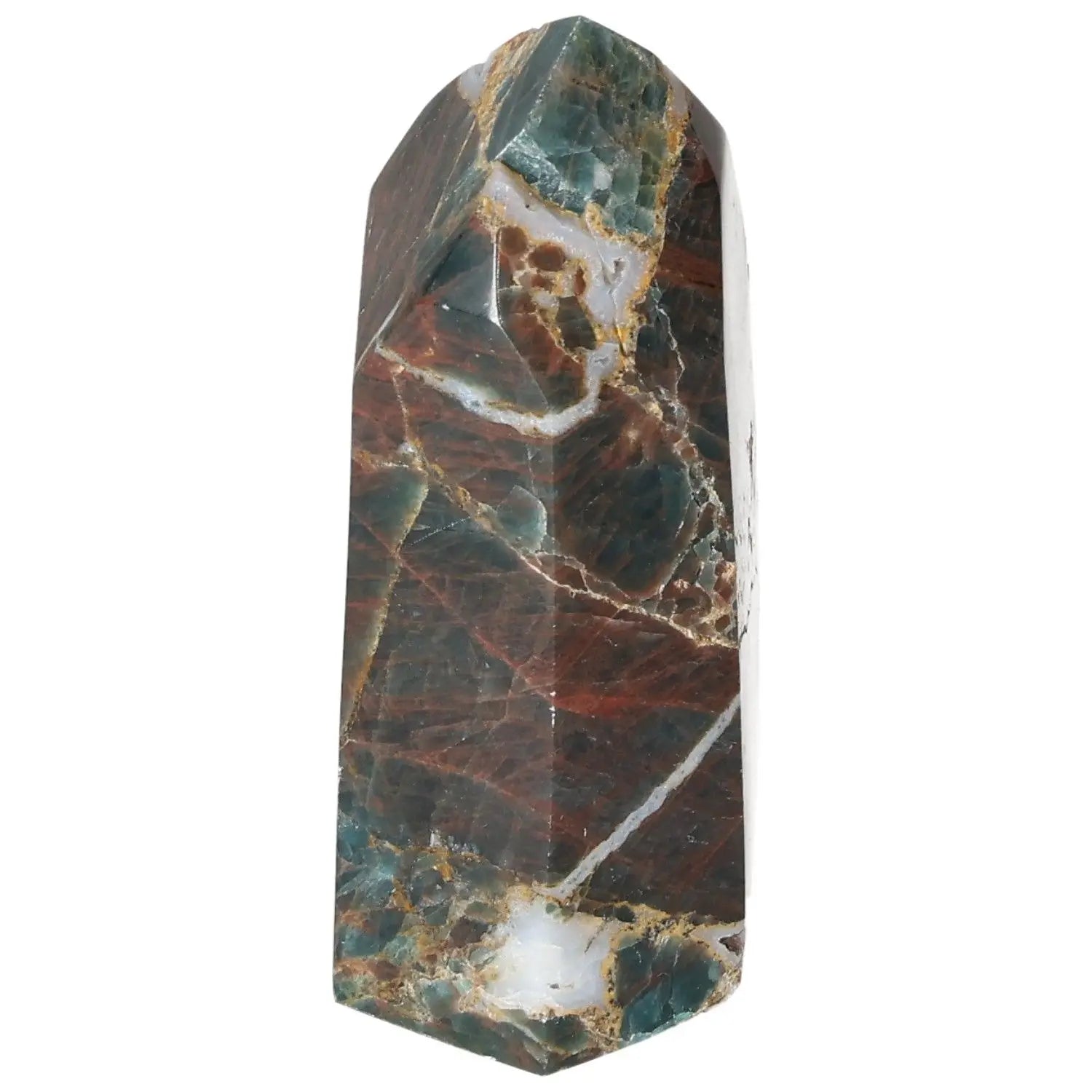 Apatite Obelisk by Sylvia Crystals, showcasing a striking blend of hues and spiritual properties, representing luxury and conscious living.