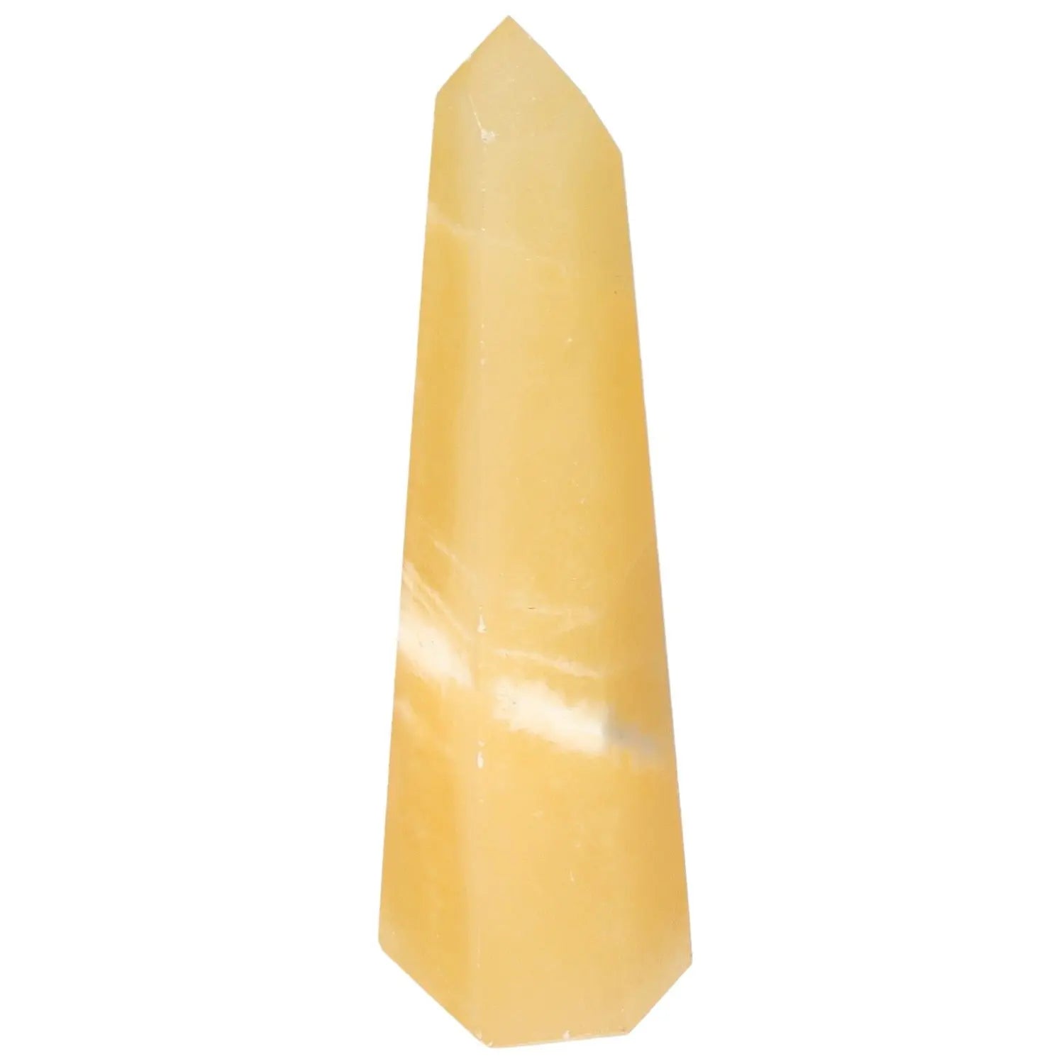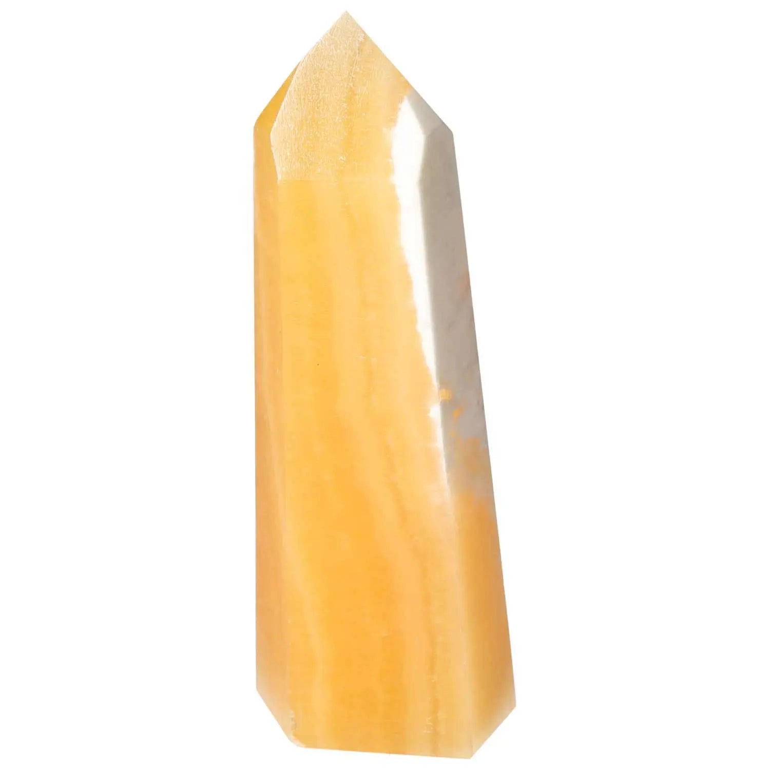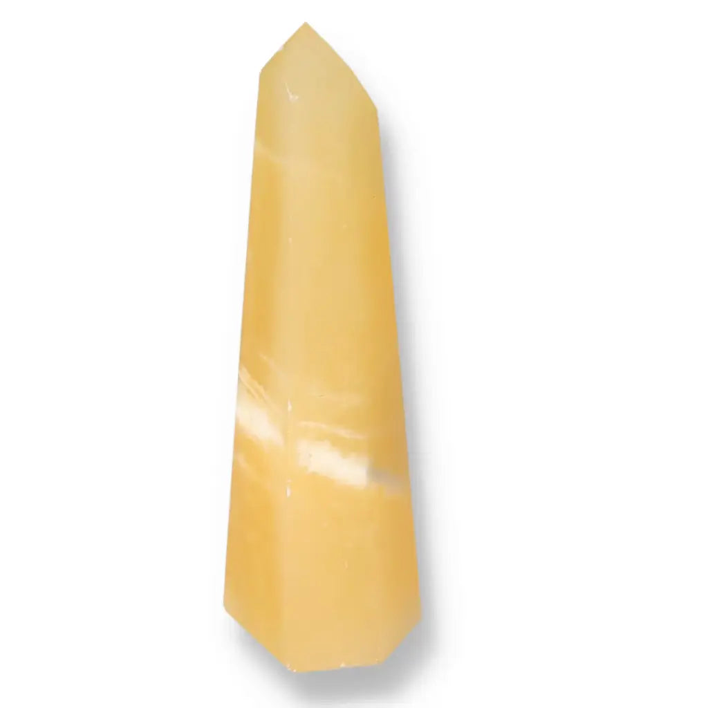 Mexican Calcite Obelisk, enhancing positivity and self-confidence, available from Sylvia Crystals. Perfect for students and professionals.
