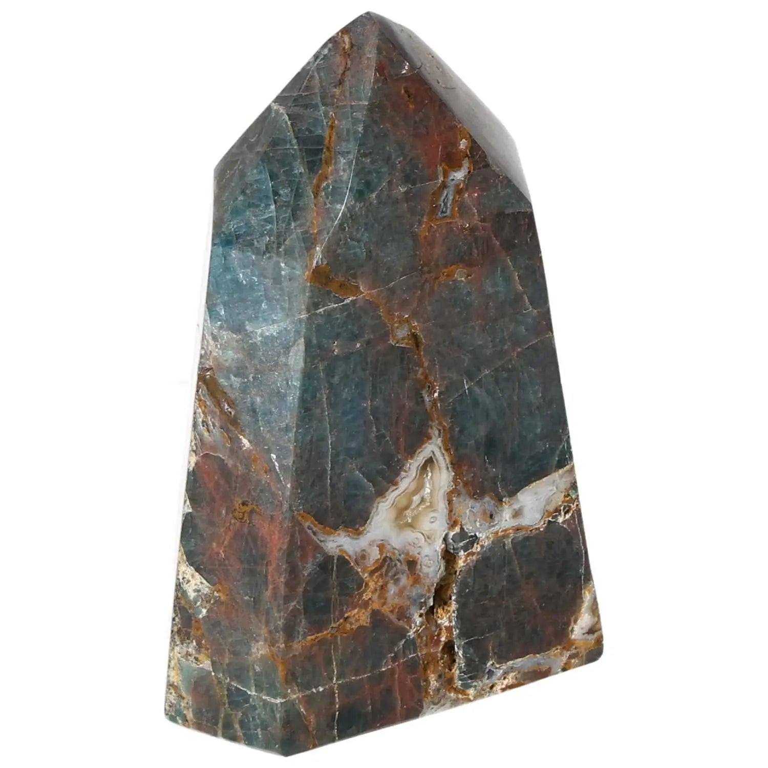 Apatite Obelisk by Sylvia Crystals, showcasing vibrant blue and brown hues, symbolizing luxury and elegance, ideal for home decor and energy.