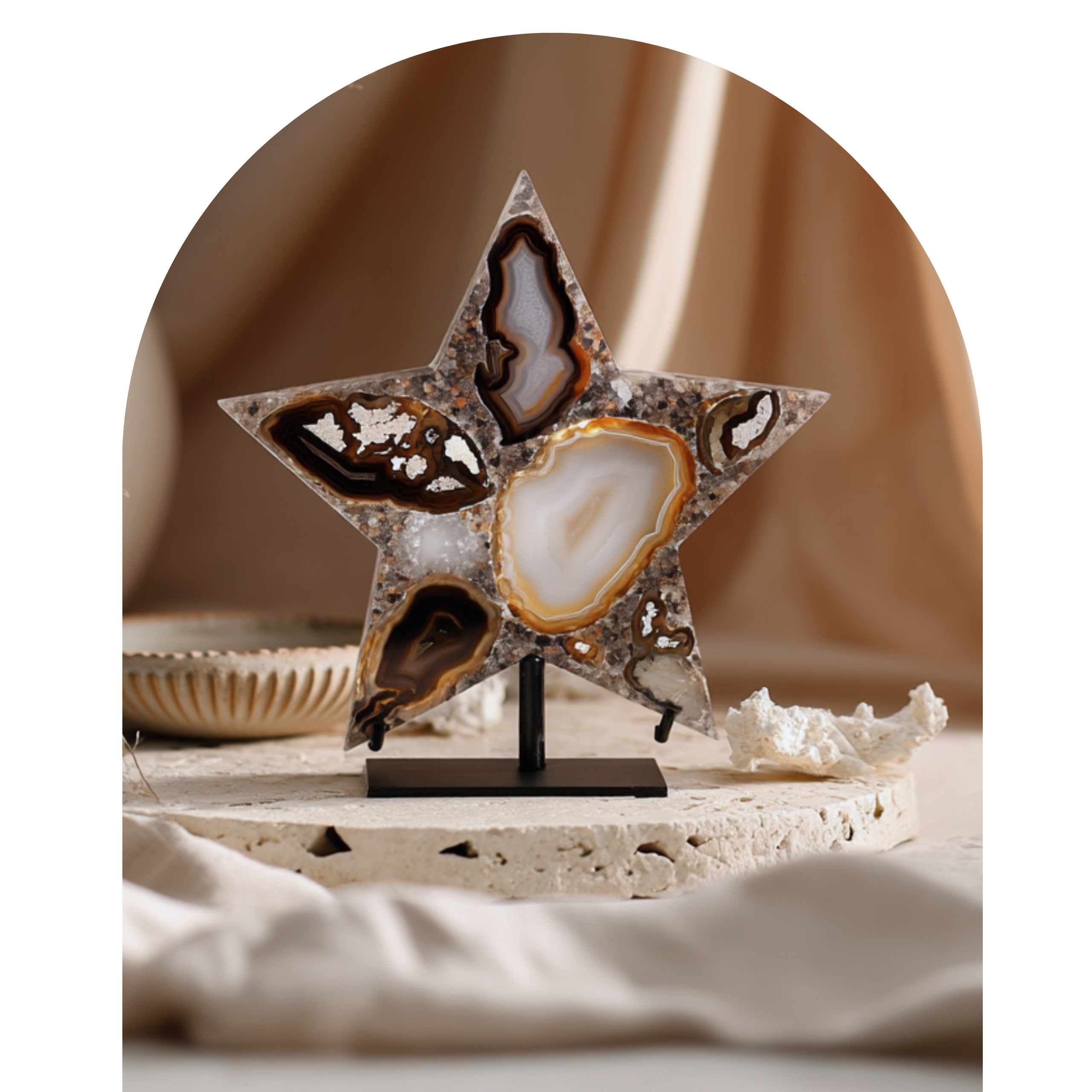 Our Agate Star Collection captures that sacred glow in natural crystal form: each piece a constellation of agate veins and golden light, born from the Earth yet shimmering with cosmic energy.