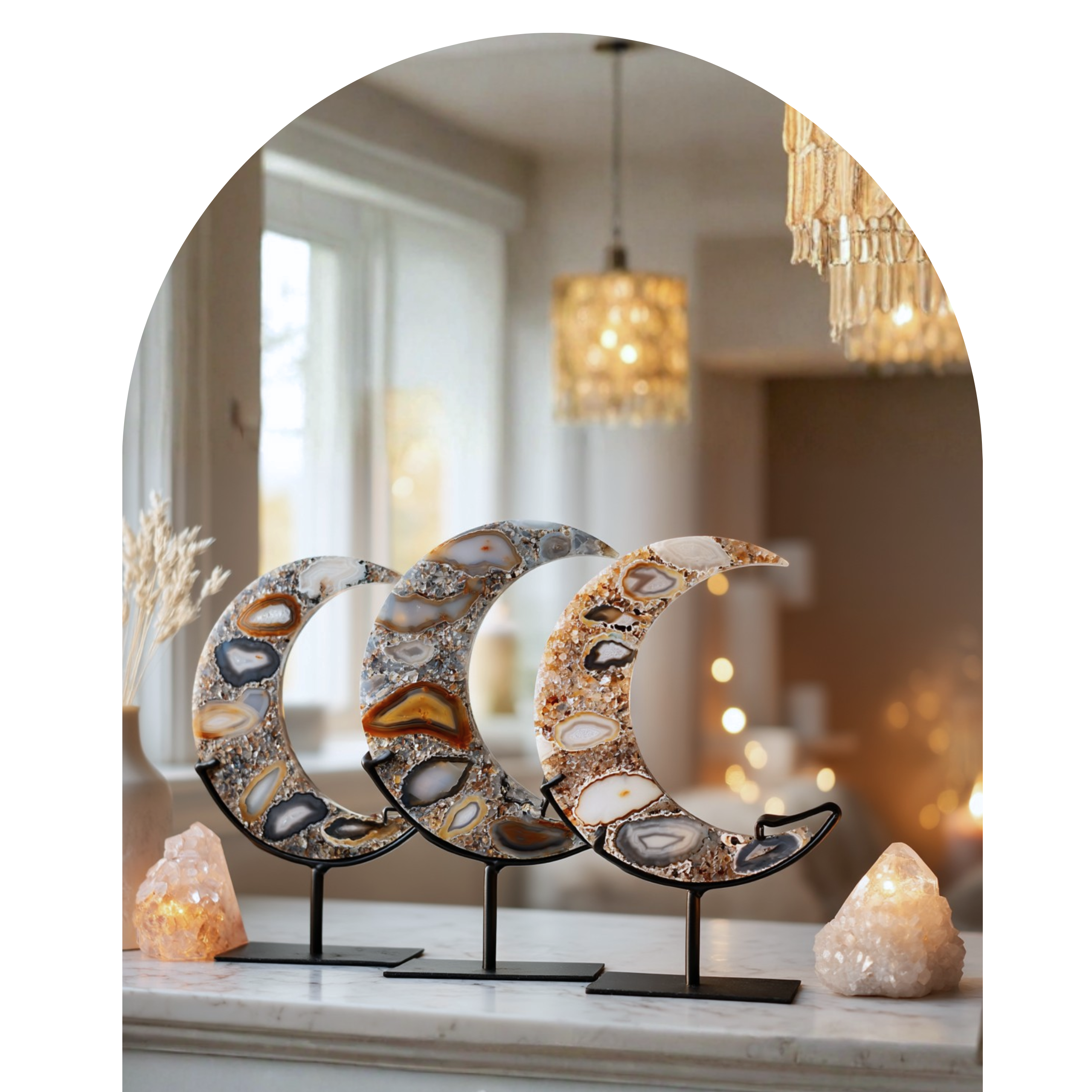 Our new Agate Moon Collection captures that lunar essence in sculpted crescents of natural agate — stones layered with Earth’s ancient whispers and veined with gold like frozen light.