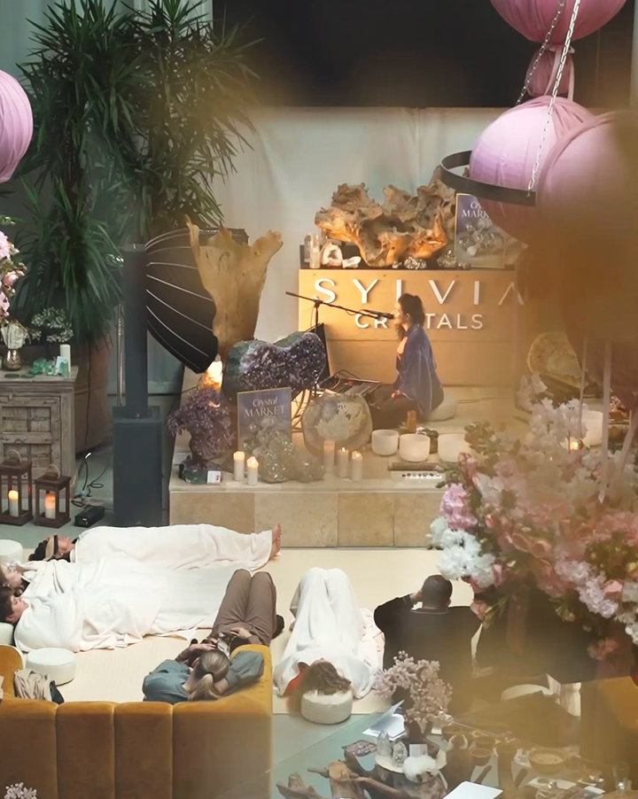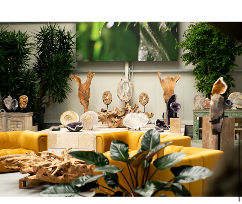 Sofas, tall plants, and crystals throughout the room create a relaxed, welcoming atmosphere.