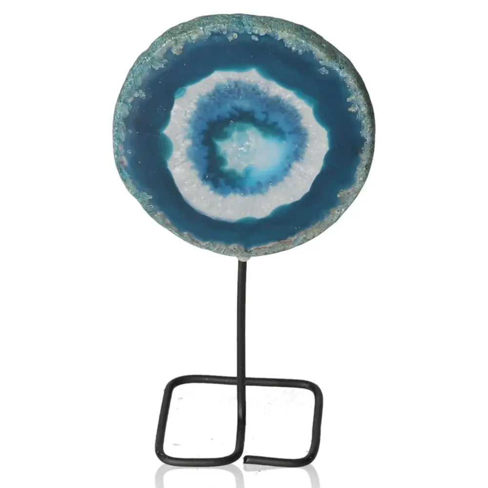 Elegantly mounted on a sleek metal stand, this agate slice serves as more than just a decorative piece. It delivers the calming energies of agate, known for balancing the body, mind, and emotions, providing a serene and stabilizing influence in your environment. Perfect for adorning living rooms, offices, or meditation spaces, it seamlessly integrates into diverse décor styles, from rustic charm to modern sophistication.