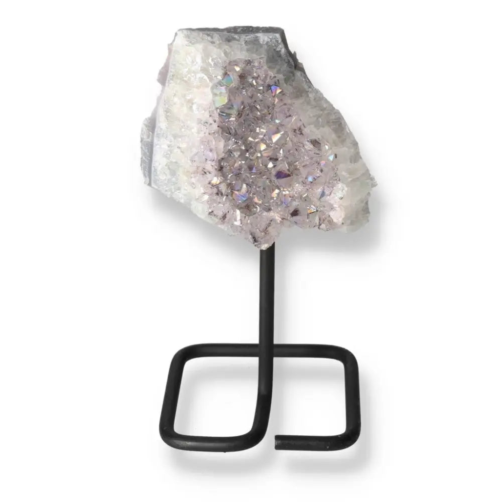 Mounted on a minimalist metal stand, it beautifully showcases the crystal’s shimmering surface.