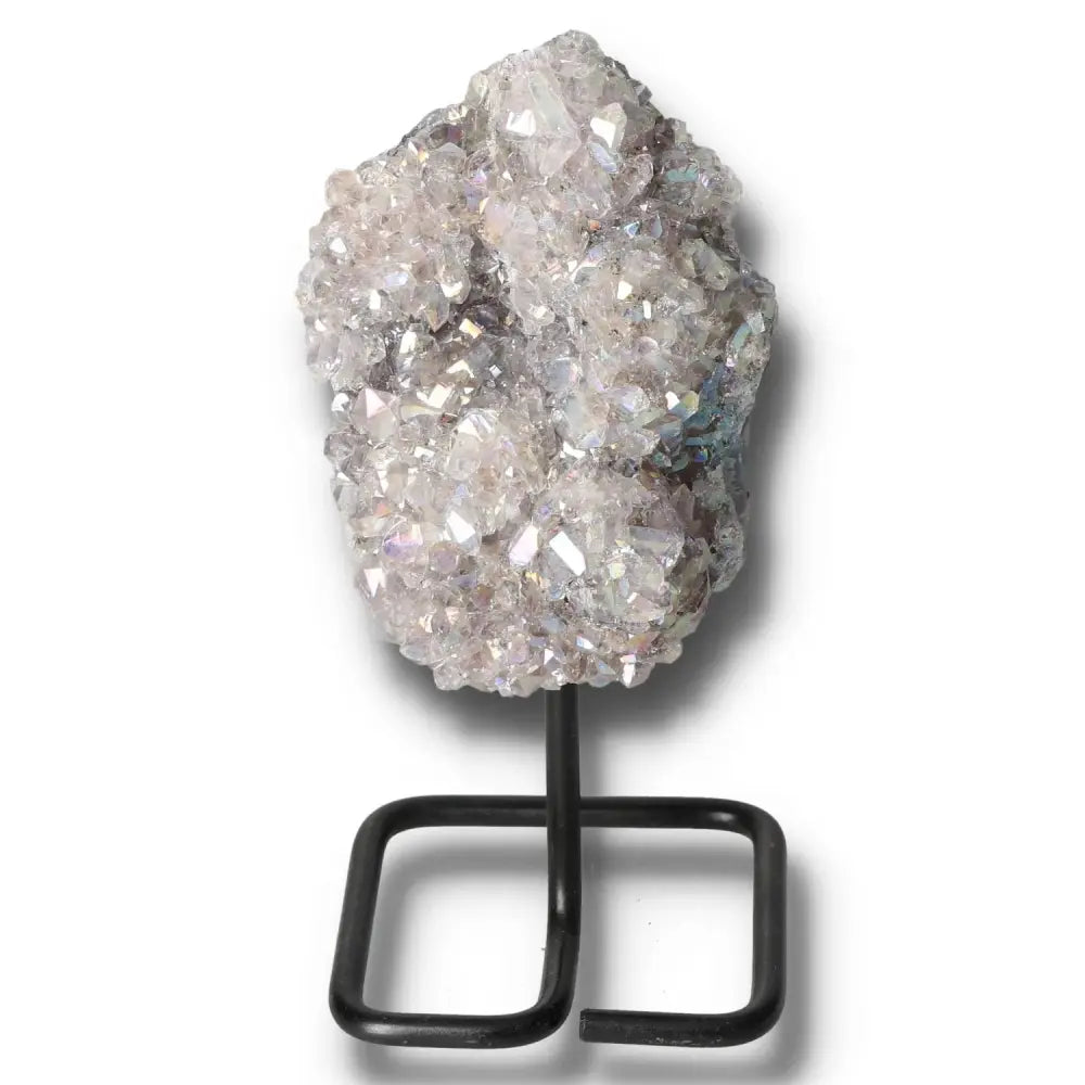 Mounted on a minimalist metal stand, it beautifully showcases the crystal’s shimmering surface.