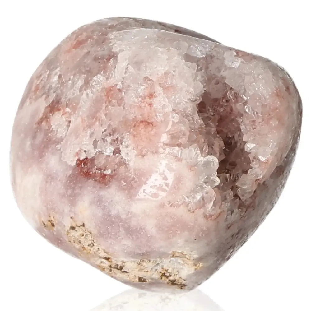 This Pink Amethyst cut base geode displays soft blush tones with delicate crystal formations. Its polished base and natural contours highlight the stone’s gentle elegance and quality.