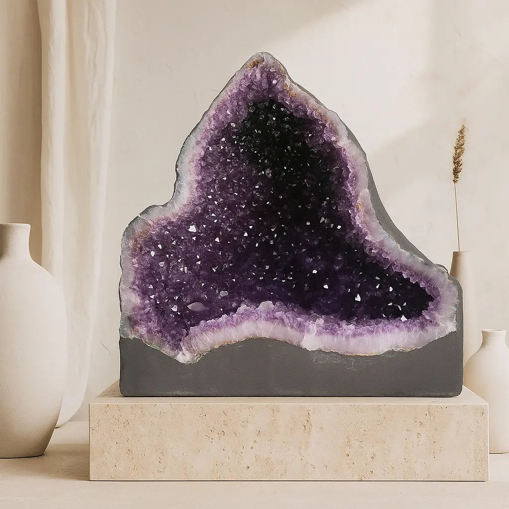 This Amethyst Cathedral features tall, arched formations lined with densely packed violet crystals. Its vertical structure and natural luster make it a breathtaking statement piece.