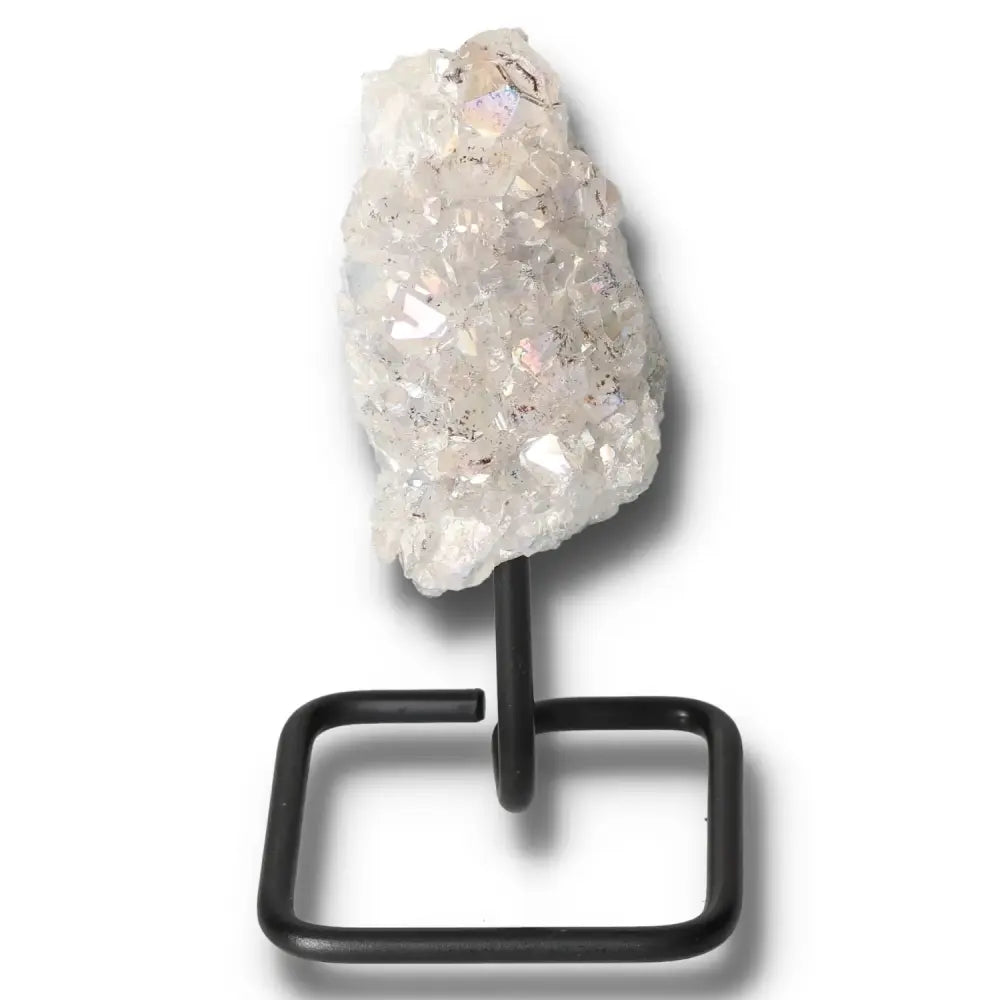 Mounted on a minimalist metal stand, it beautifully showcases the crystal’s shimmering surface.