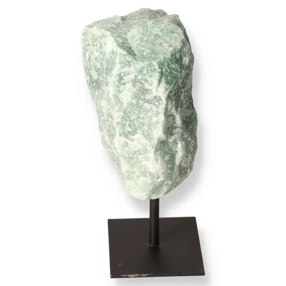 This Green Quartz is more than just a decorative element; it is a vessel of positive energy. Celebrated for its ability to foster emotional healing and balance, it invites a calming aura into your environment. Mounted on a sleek metal stand, this quartz seamlessly merges the raw beauty of nature with modern elegance, making it a versatile addition to any décor.