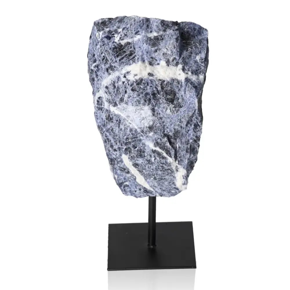 A piece of sodalite on stand, vivid deep blue with gentle light streaks, crafted to bring refined earthy charm.