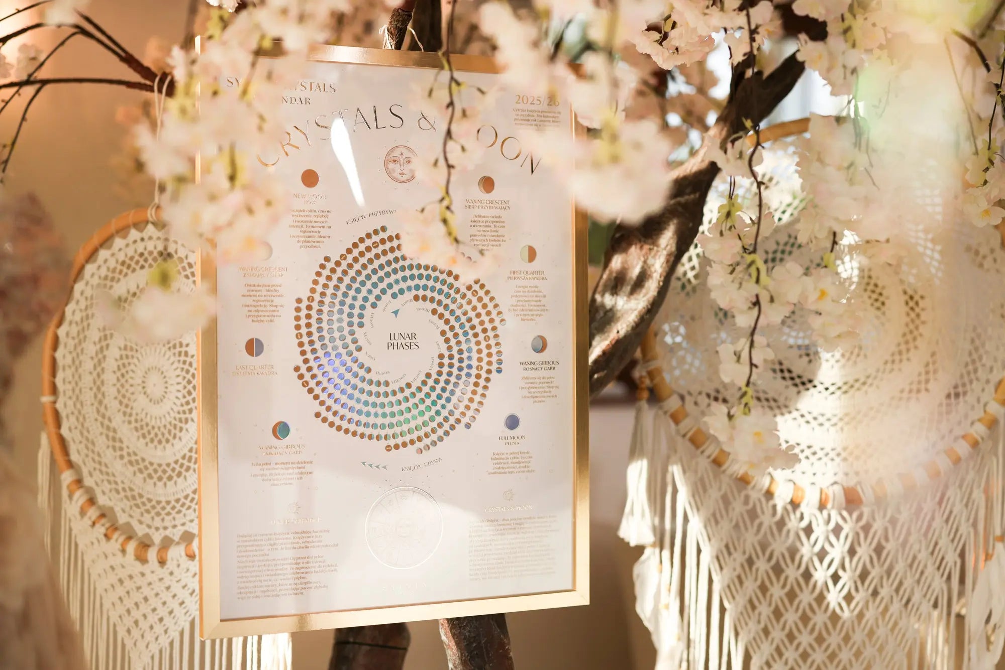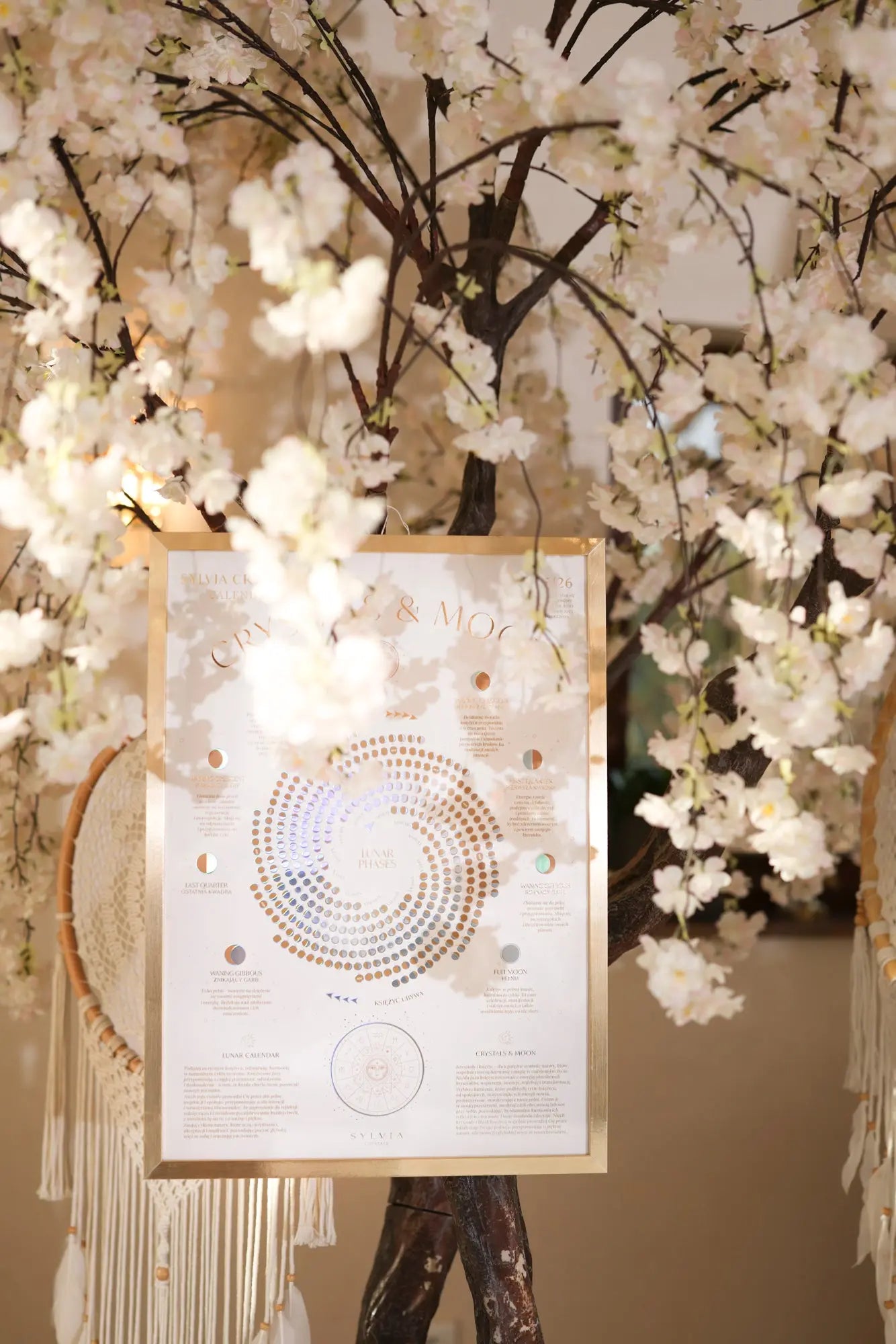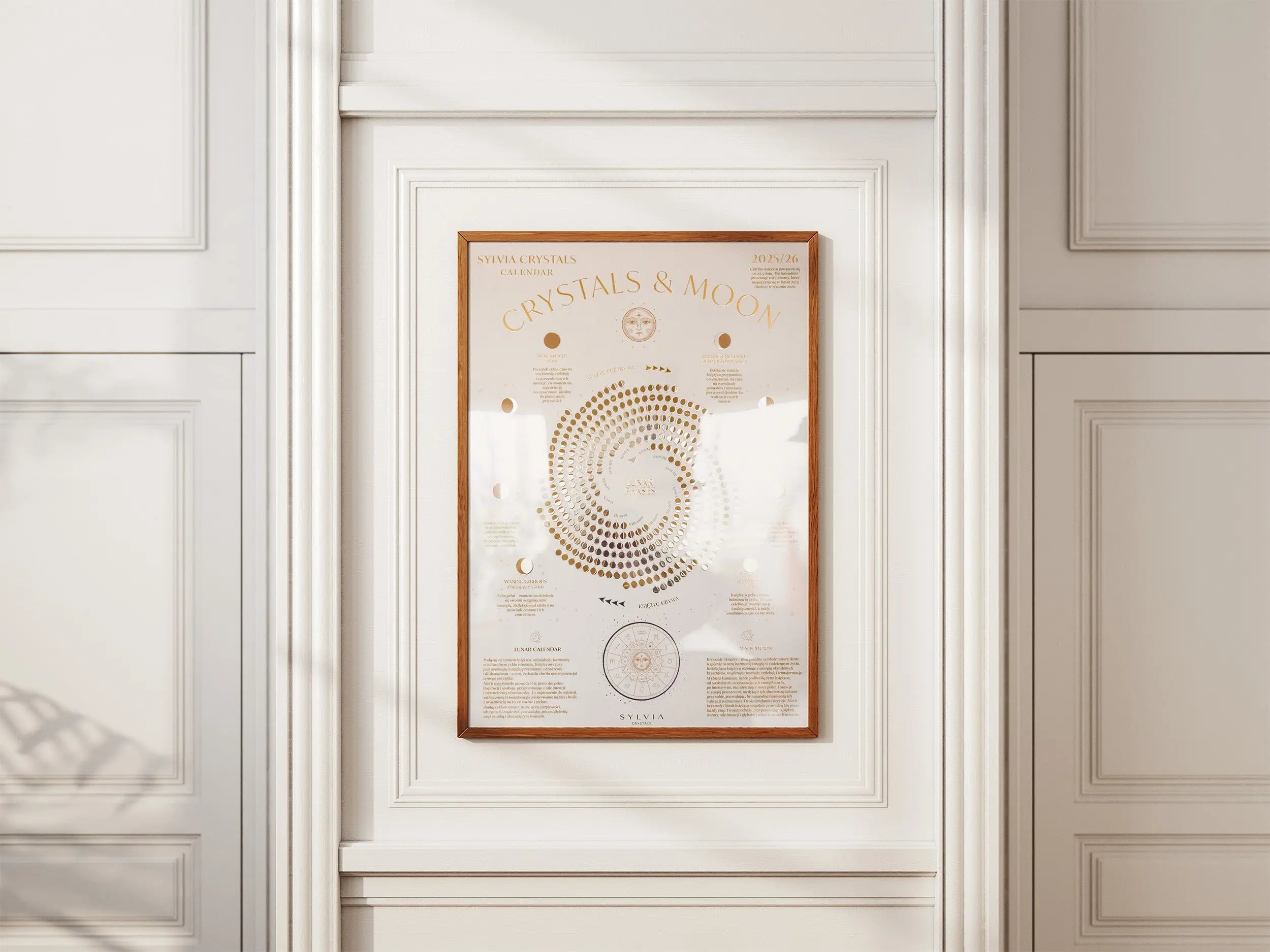 Designed with the highest attention to detail, the calendar features premium printing enhancements, including gold accents and holographic techniques, creating spectacular visual effects. The Moon phases subtly shift with light and perspective, making the calendar visually dynamic, ensuring it never looks the same throughout the day. Framed in a sturdy, gold A2 frame, it serves not only as a practical tool but also as an elegant interior decoration.