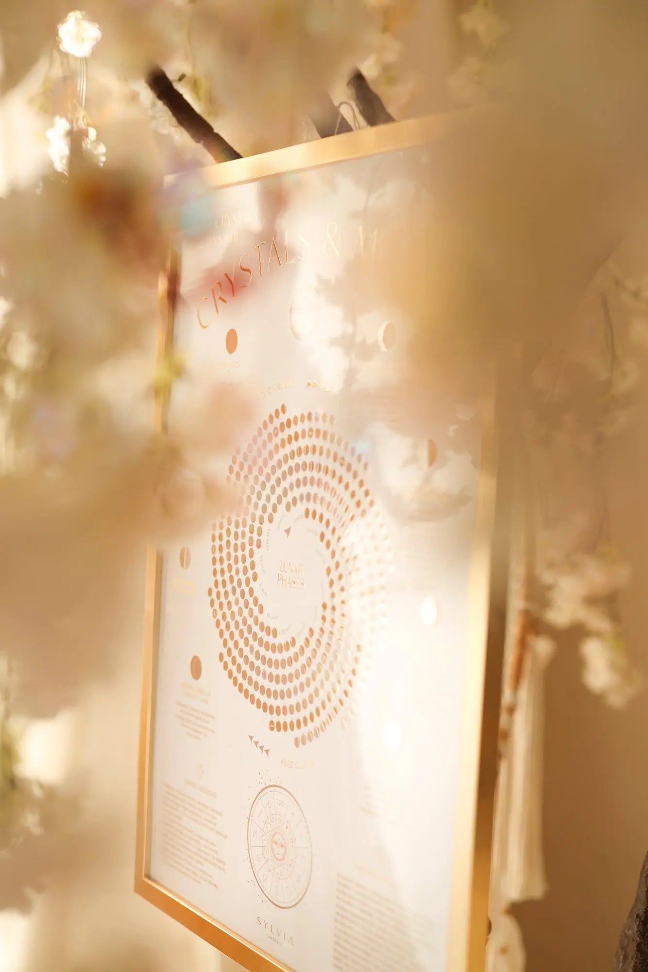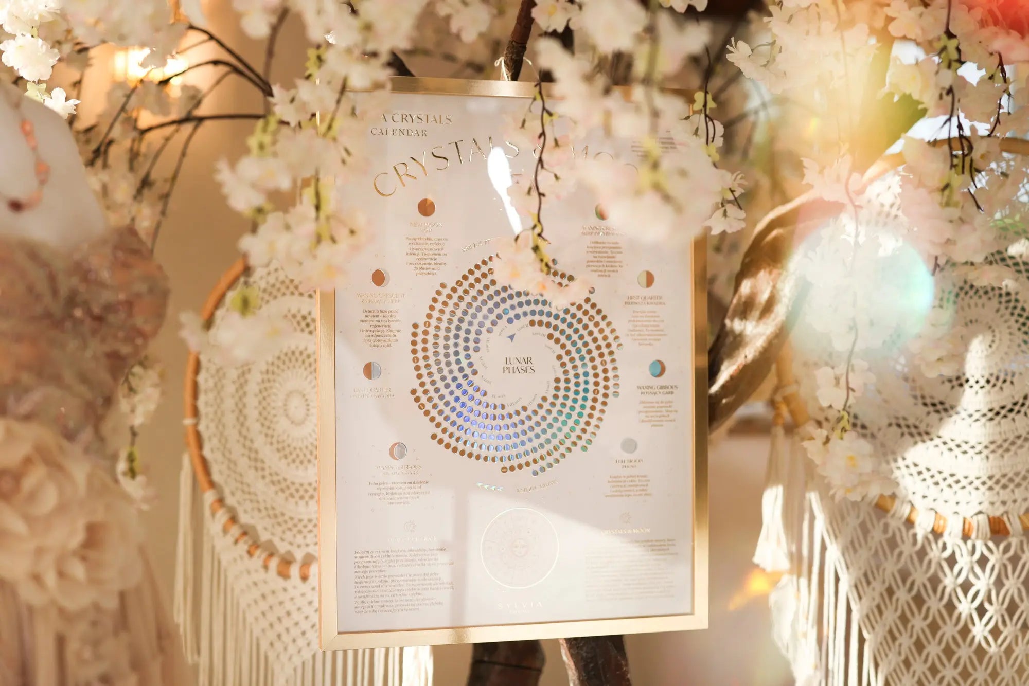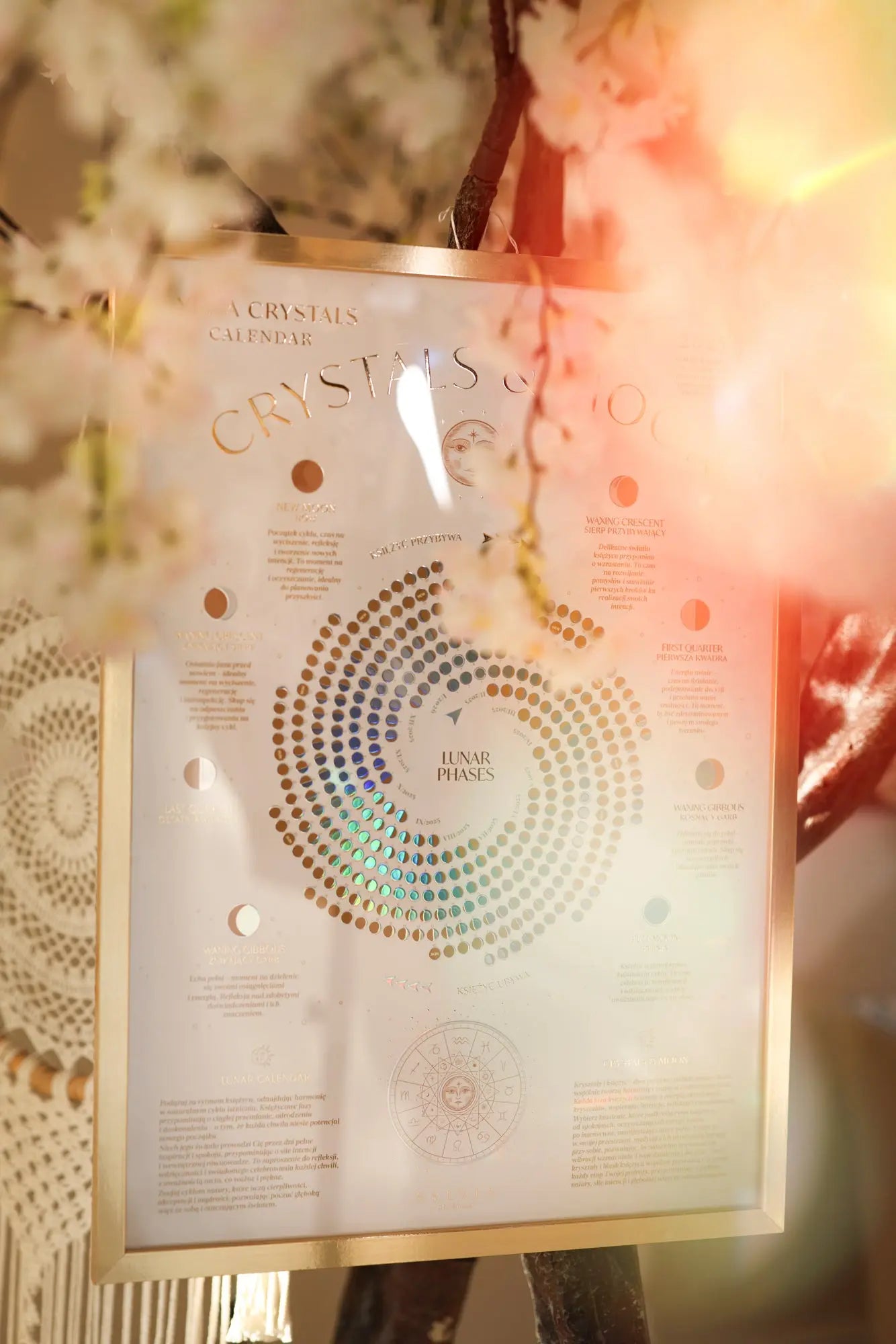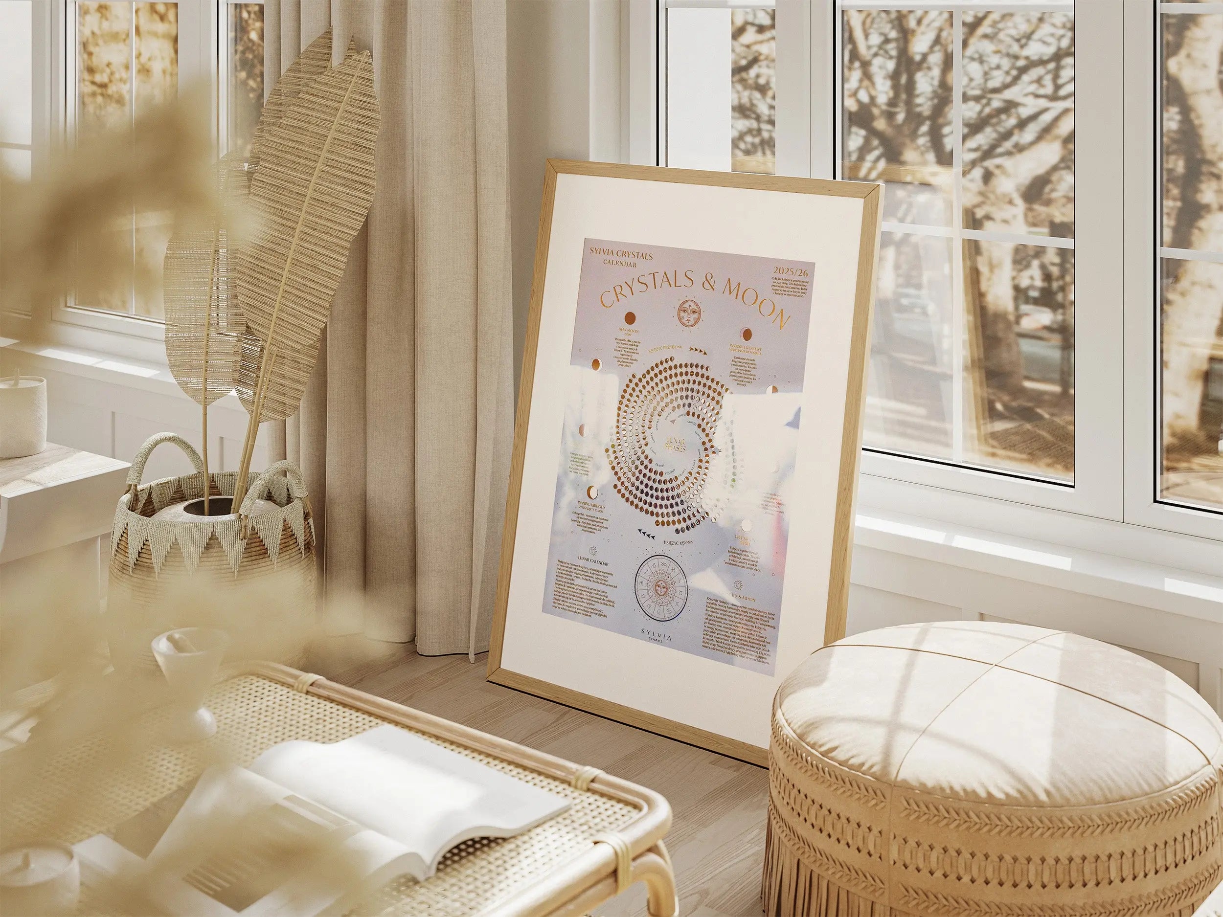 The Lunar Calendar “CRYSTALS & MOON” by Sylvia Crystals is a unique and one-of-a-kind tool for working with the Moon’s cycles and crystal energy. This practical, year-long guide to daily Moon phases is designed as a luxurious framed graphic, allowing for quick orientation in the current lunar cycle. It supports daily spiritual practice while bringing a radiant crystal energy into your space.