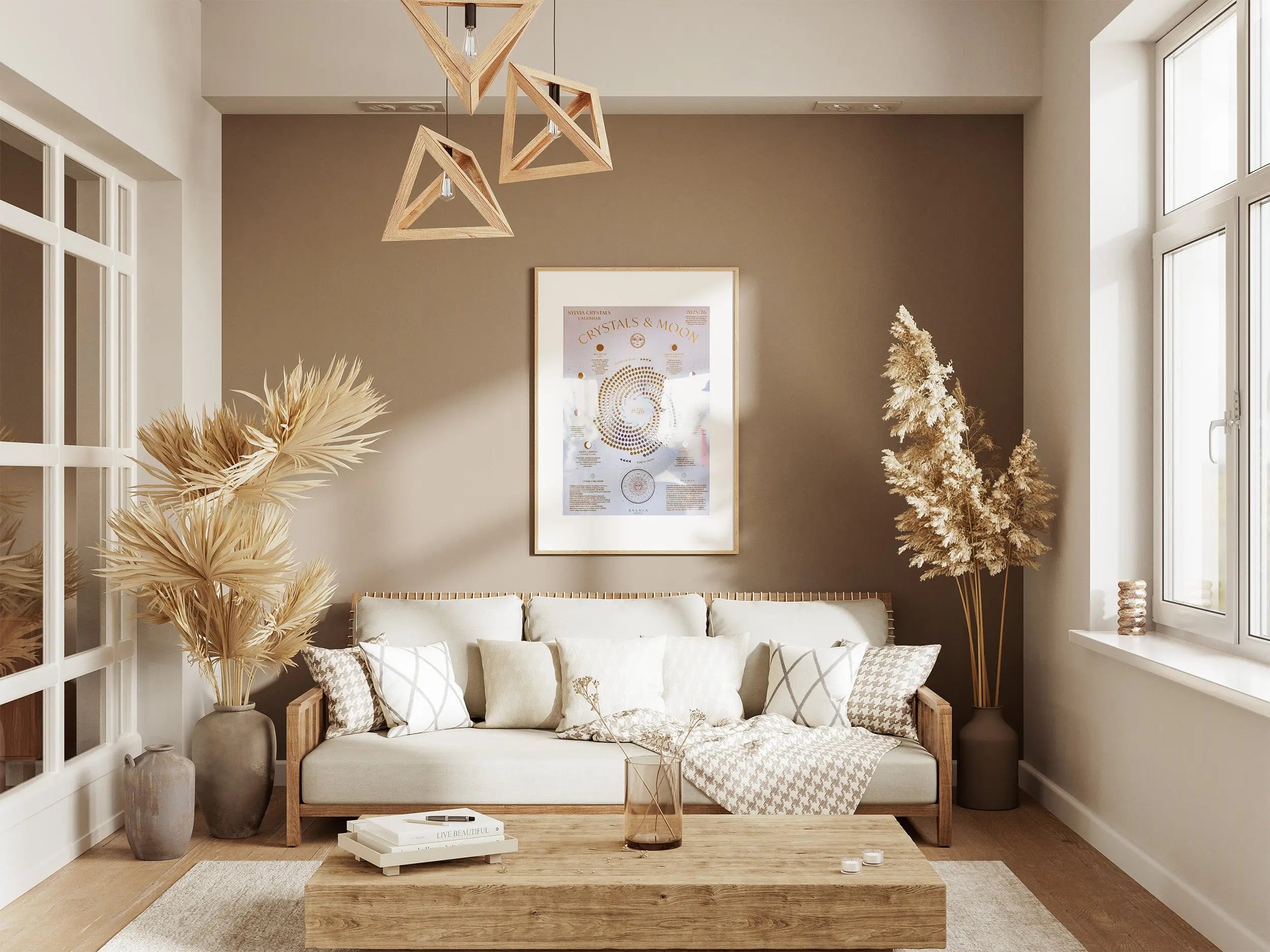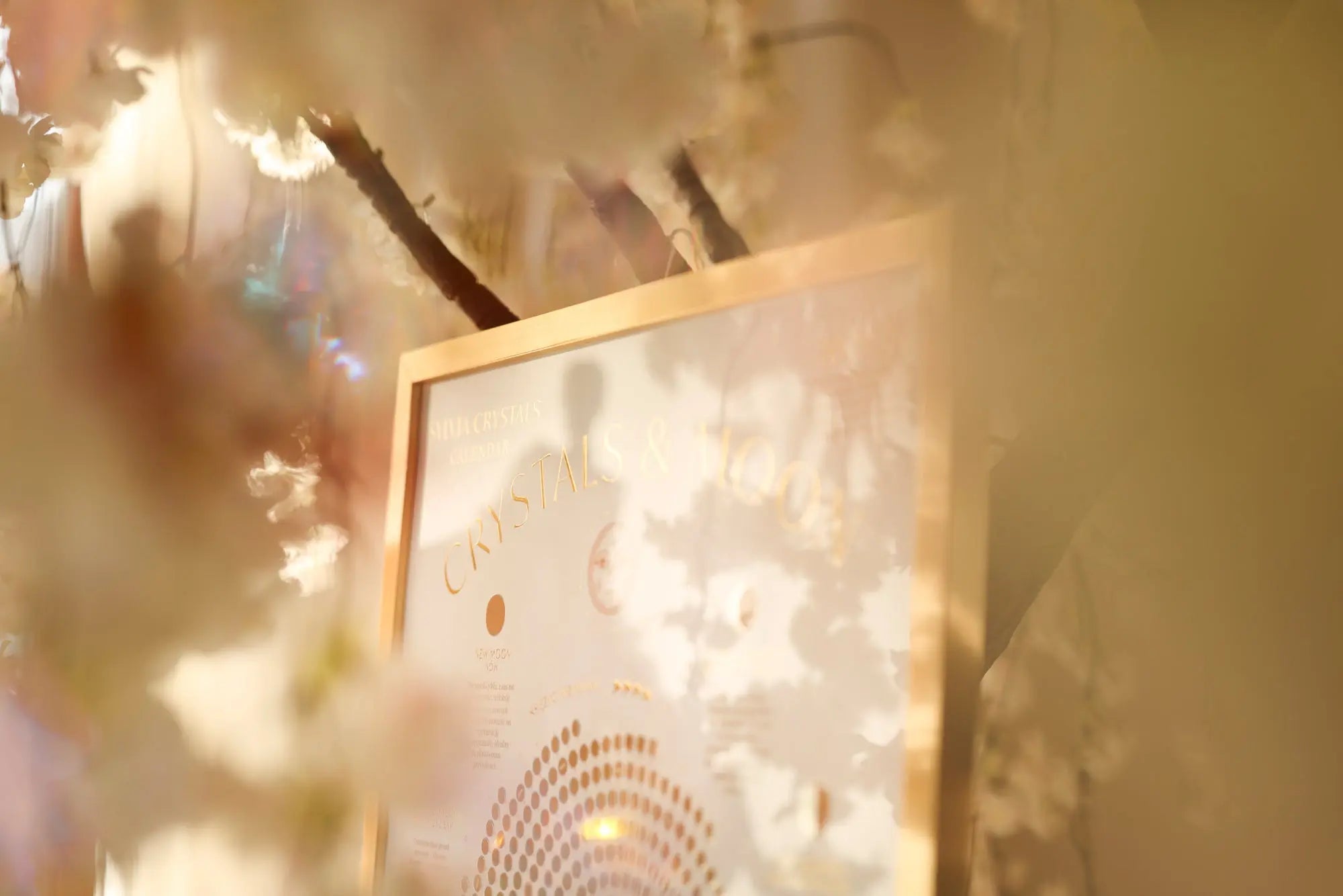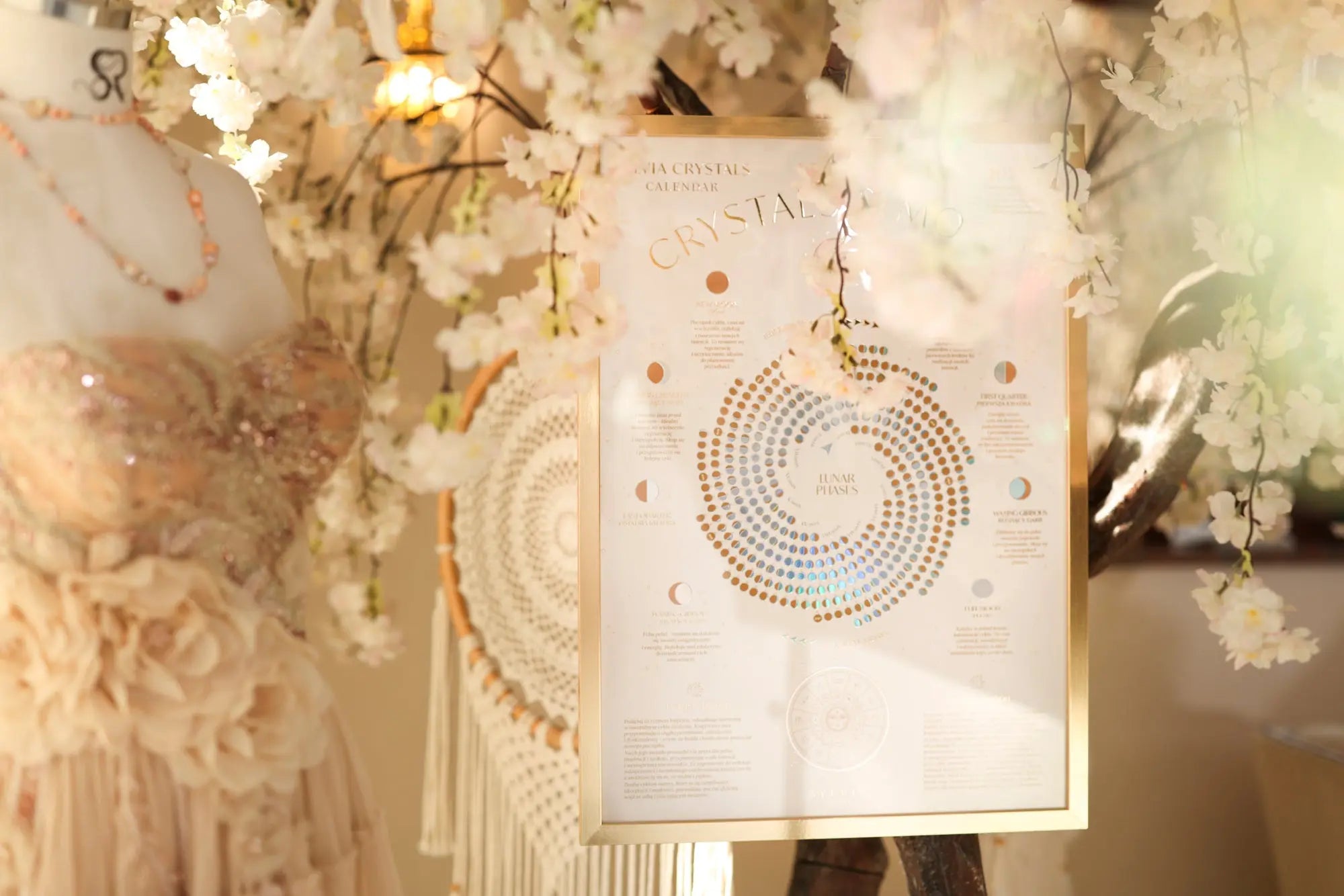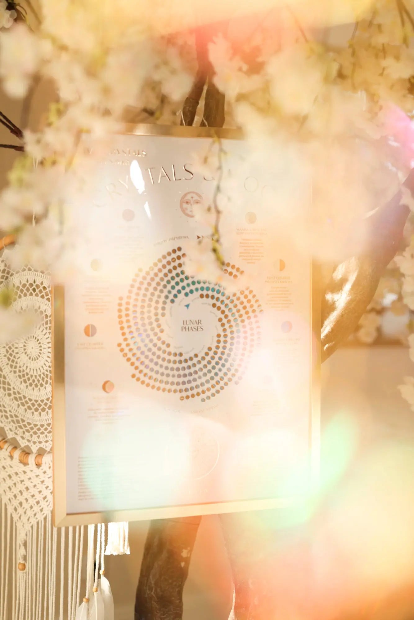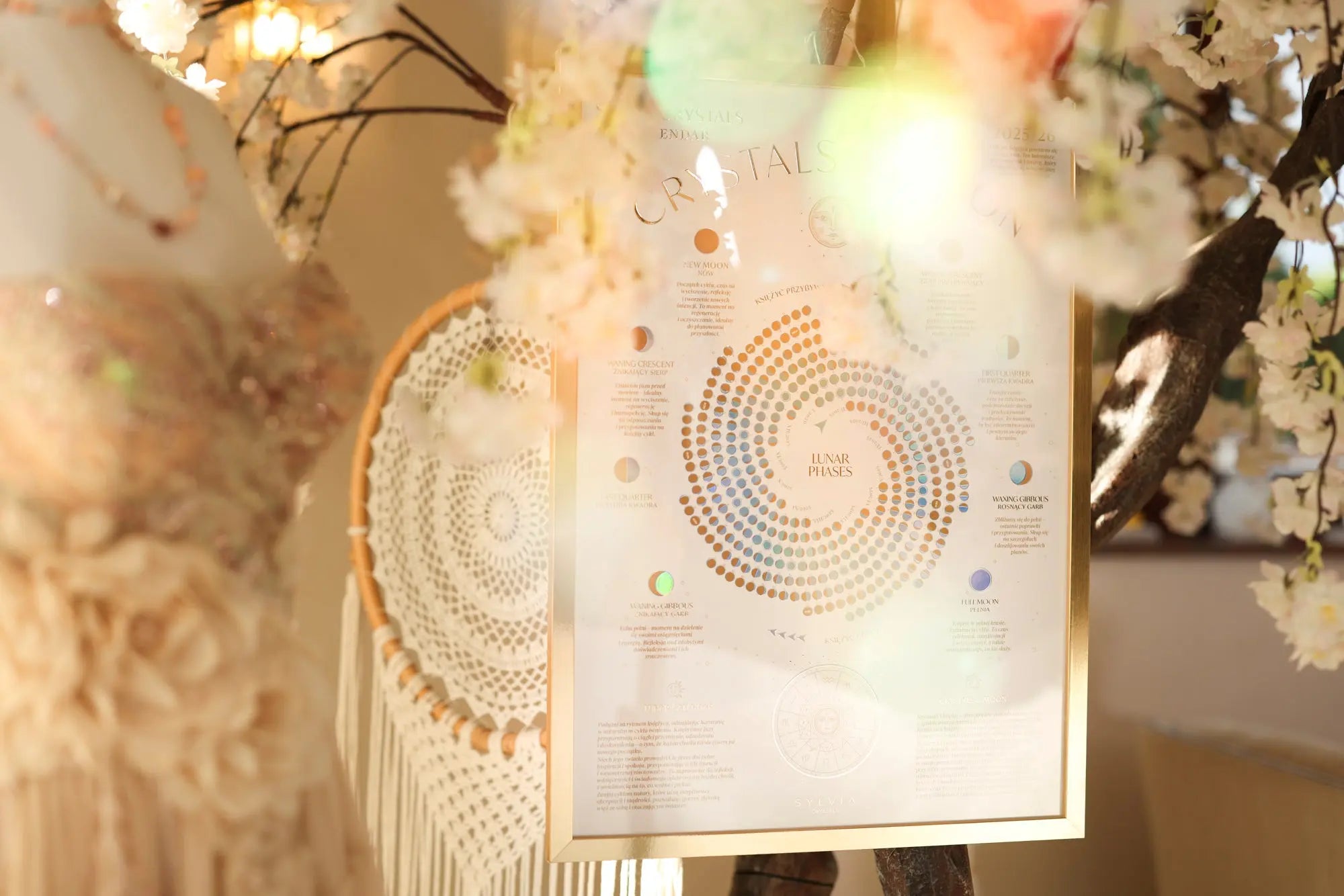 The Lunar Calendar “CRYSTALS & MOON” by Sylvia Crystals is a unique and one-of-a-kind tool for working with the Moon’s cycles and crystal energy. This practical, year-long guide to daily Moon phases is designed as a luxurious framed graphic, allowing for quick orientation in the current lunar cycle. It supports daily spiritual practice while bringing a radiant crystal energy into your space.