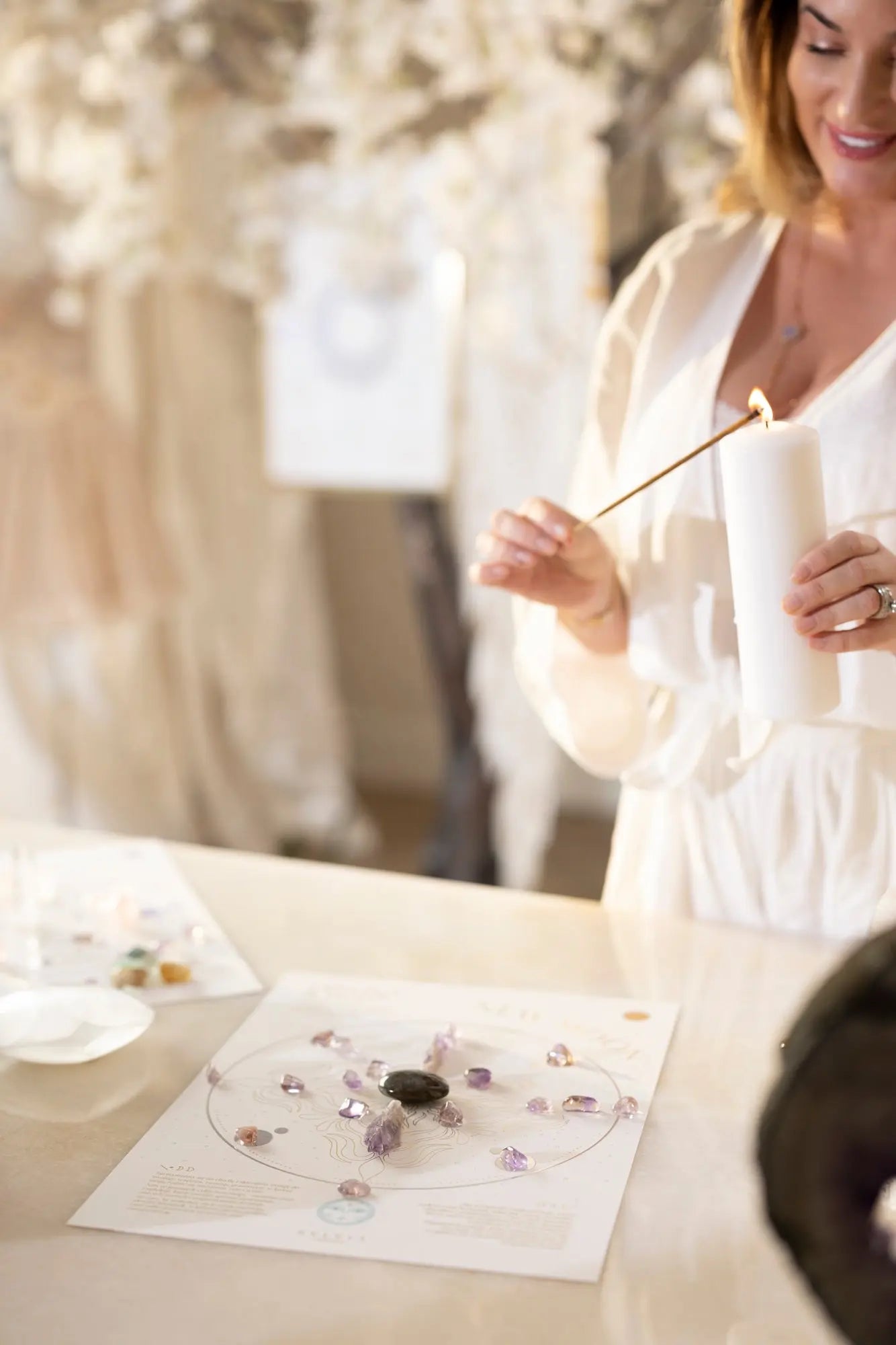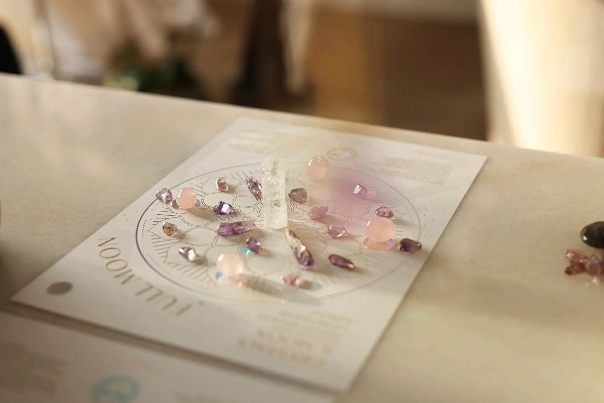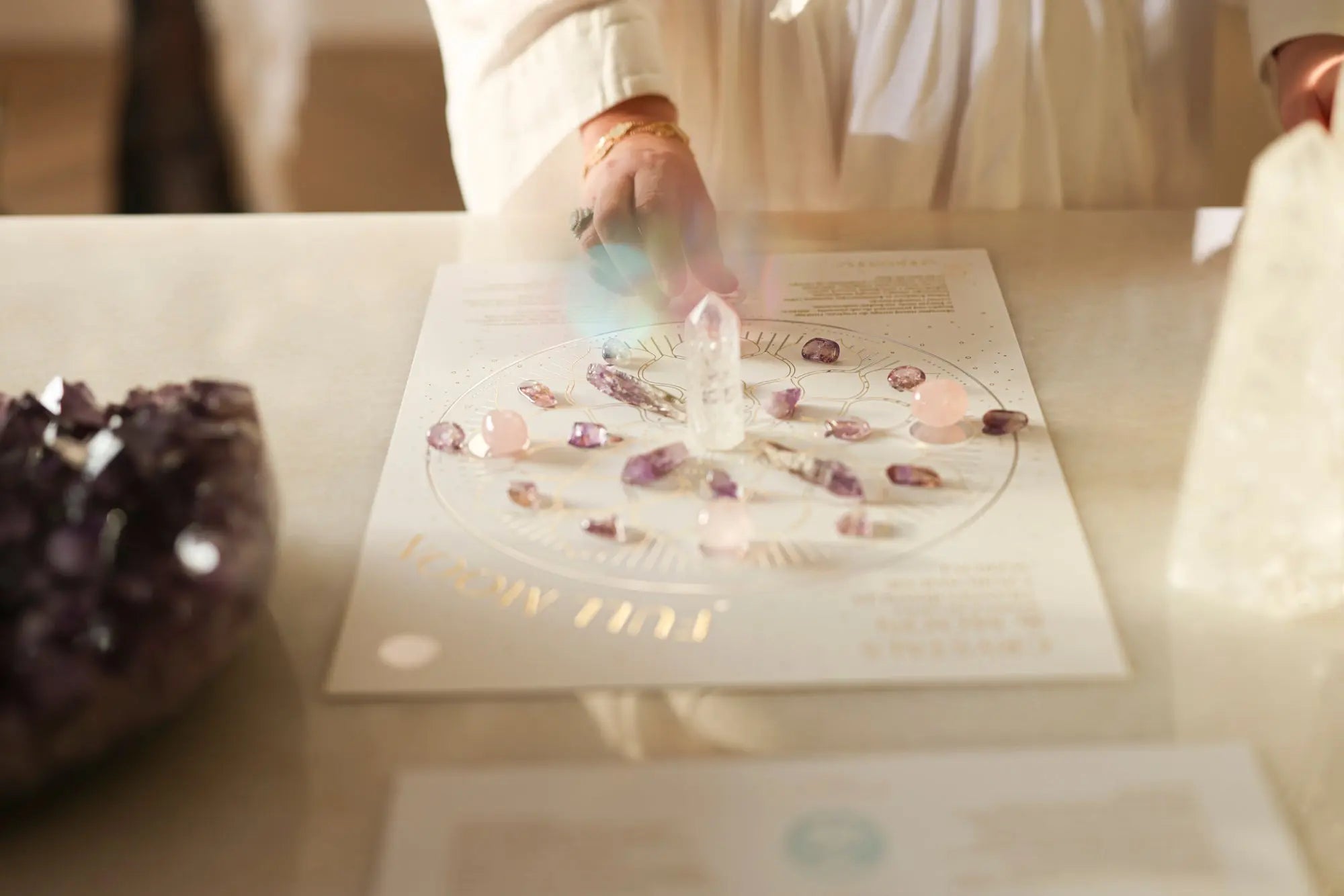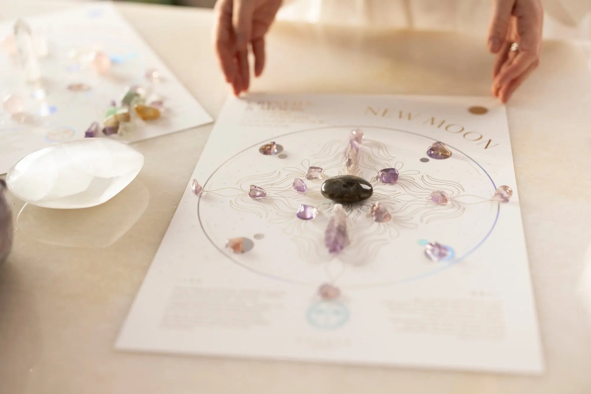 As additional tools, the set includes two A3-sized (297x210 mm) crystal grid boards, specially designed for working with crystals during the most important lunar phases: New Moon and Full Moon. Select your stones according to your intentions and place them intuitively, following the guidance on the boards or on our website. Our advisors are also available to help you choose the right crystals for your rituals. Each lunar cycle presents a new opportunity to create a unique grid layout that will support your intentions and goals for the next lunar month.