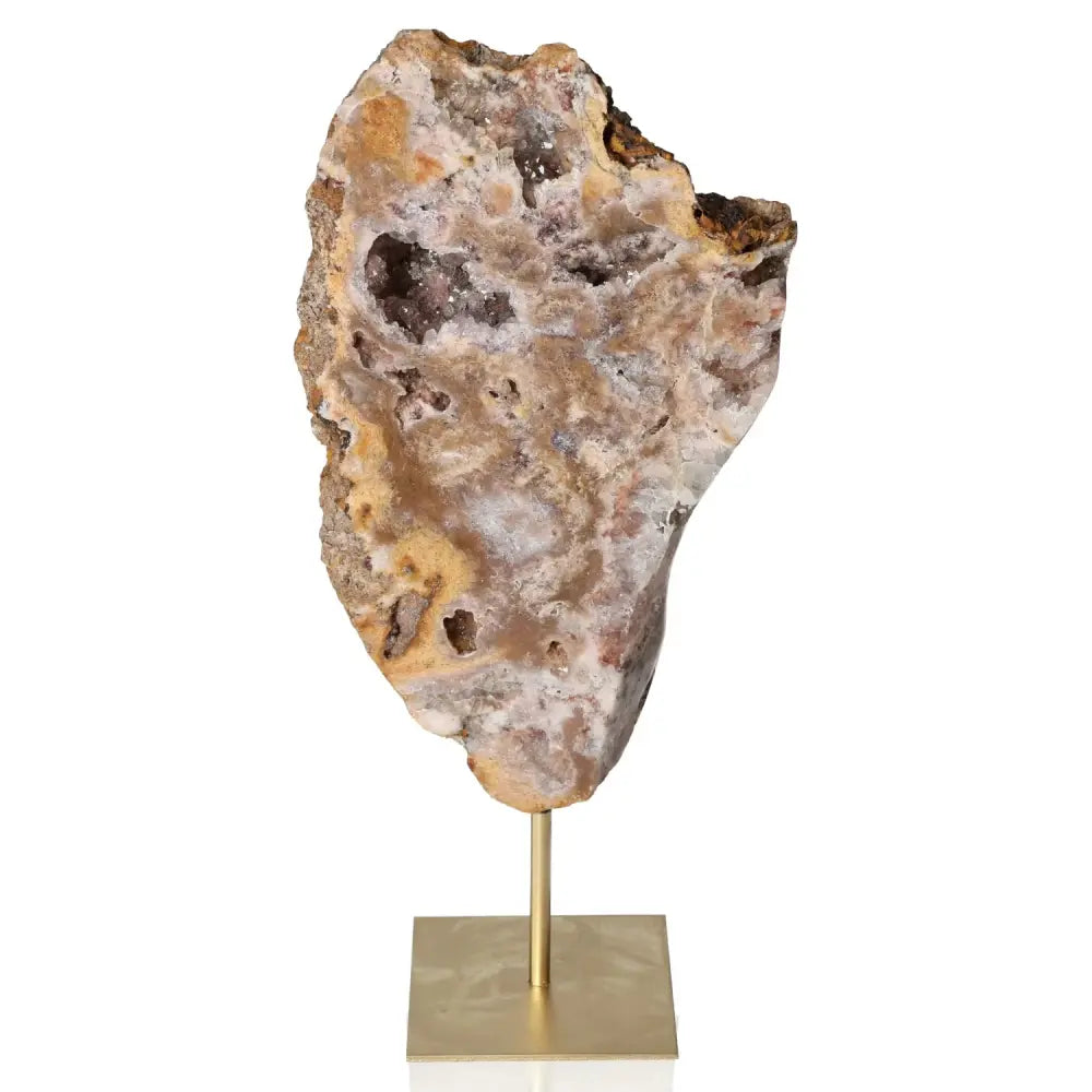 This Pink Amethyst Slice on a sleek metal base brings natural beauty and calm vibes to any space. Its shades range from soft blush to rich rose, making it a standout decorative piece with subtle energy.
