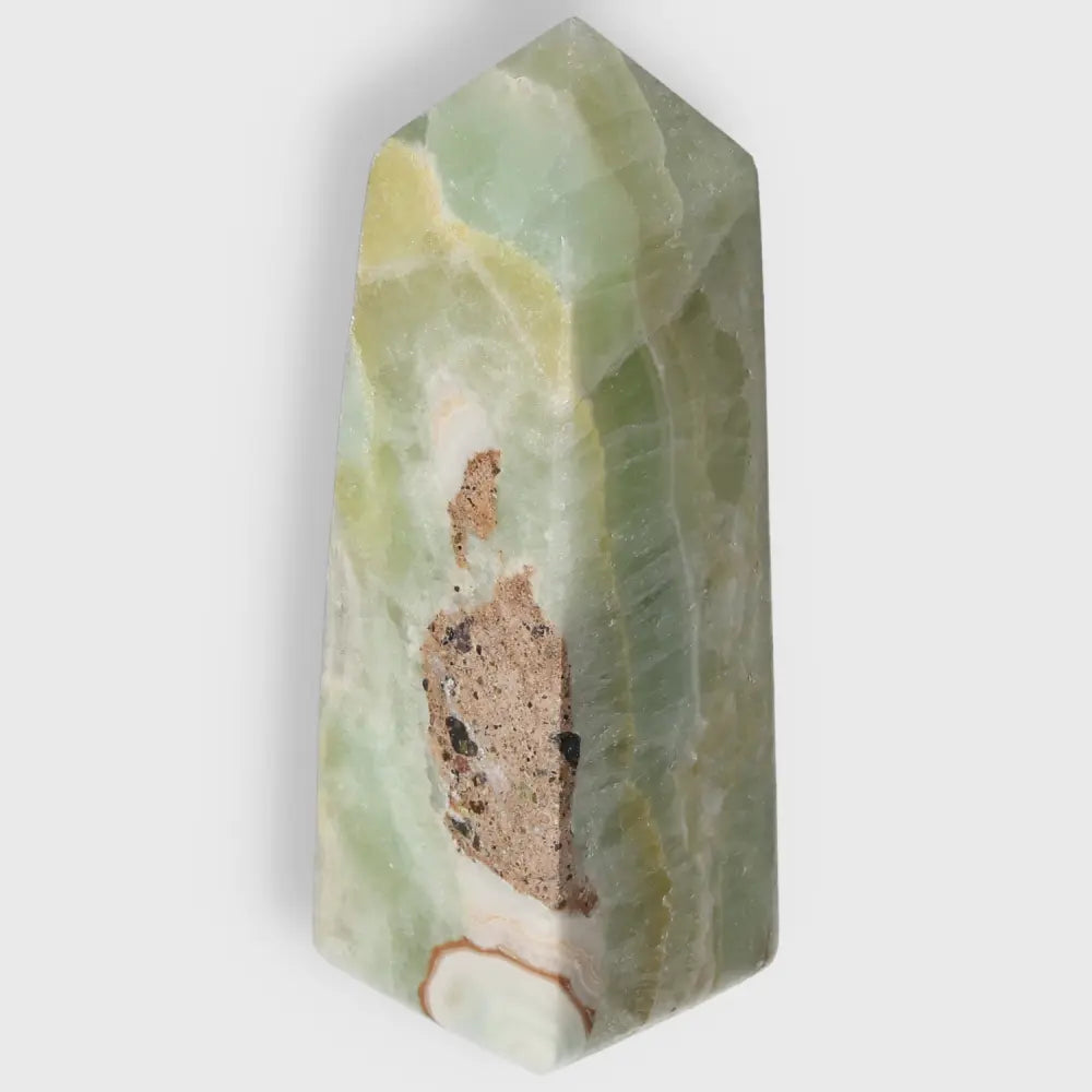 Pistachio Calcite Tower with pale green hues for calm and harmony, featuring natural artistry and soothing metaphysical properties.