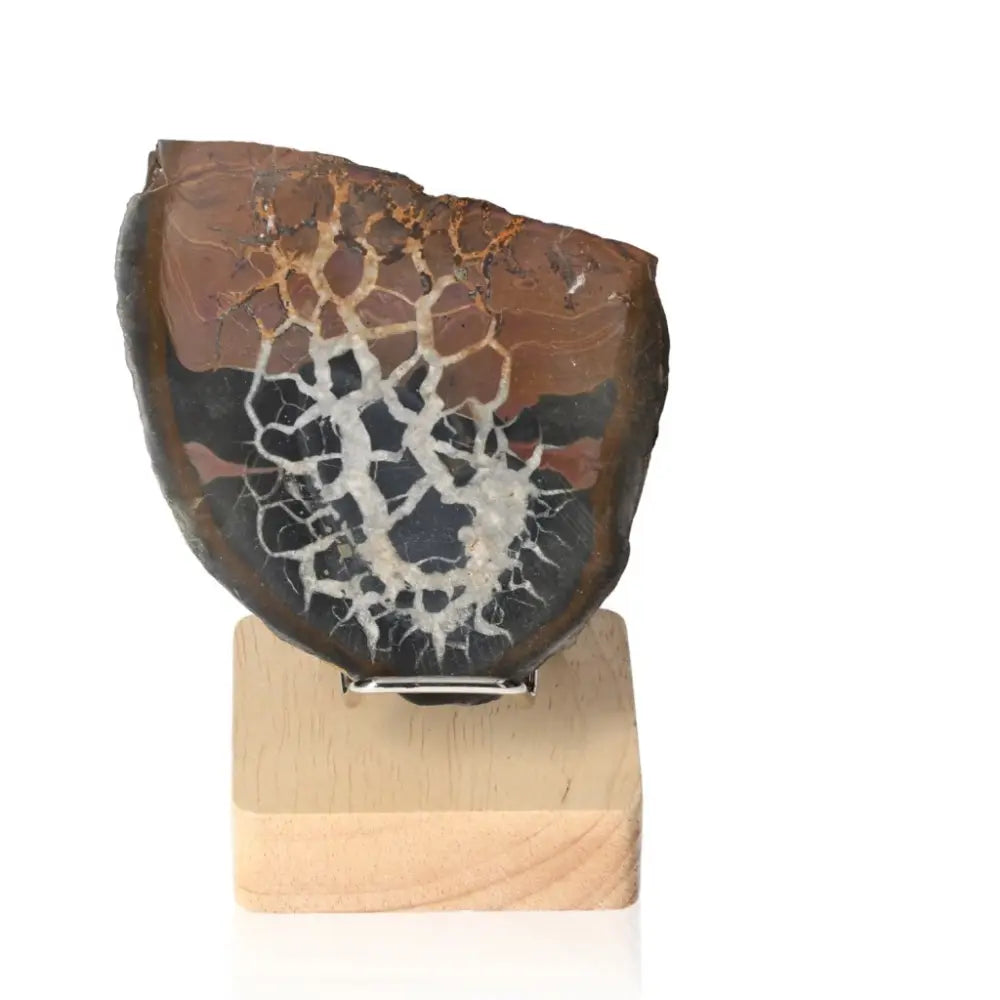 Septarian Dragon Stone with unique patterns on a wooden display stand, symbolizing power and resilience.