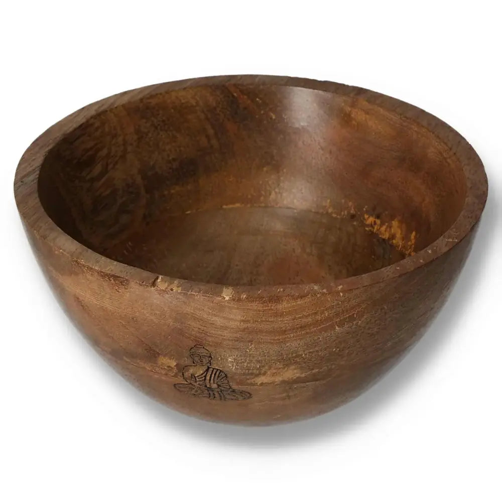 Wooden smudge and ritual bowl with Buddha engraving, 13x7cm, ideal for meditation or offering rituals.