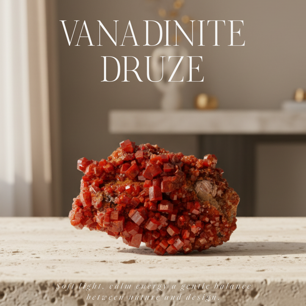Upplev den eldiga energin hos Vanadinite, en livfull röd-orange ädelsten känd för sina unika hexagonala kristaller och jordande egenskaper. Vördad som en sten av drivkraft och uthållighet, förbättrar Vanadinite fokus, inspirerar kreativitet och stödjer energiflödet, vilket gör den idealisk för att uppnå mål. Perfekt för meditation, manifestation eller som ett fantastiskt utställningsobjekt, ger Vanadinite vitalitet, beslutsamhet och klarhet till ditt liv. Omfamna den energigivande kraften hos Vanadinite idag!